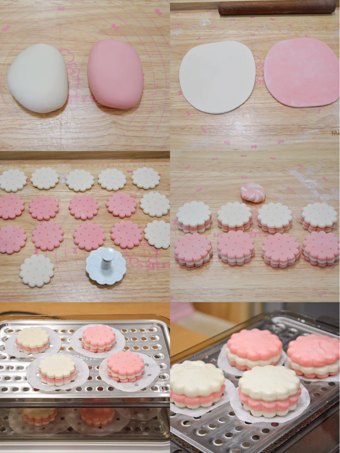 5️⃣3个面片一组,下面2片的表面抹水,粘合在一起;码放在蒸锅里;