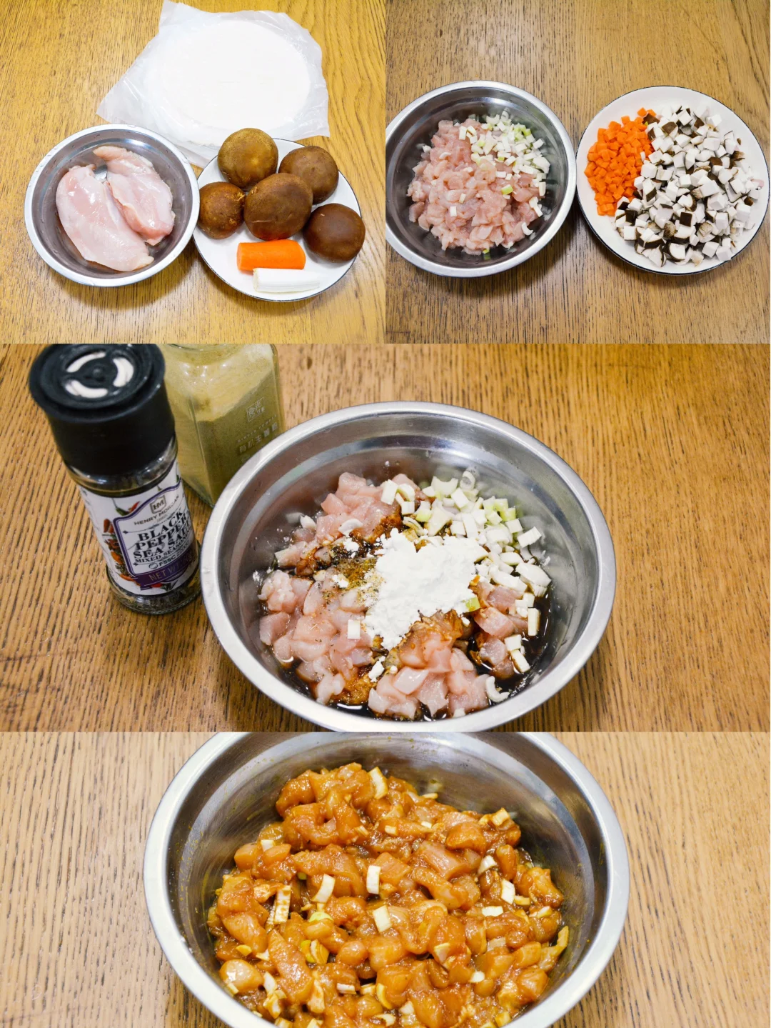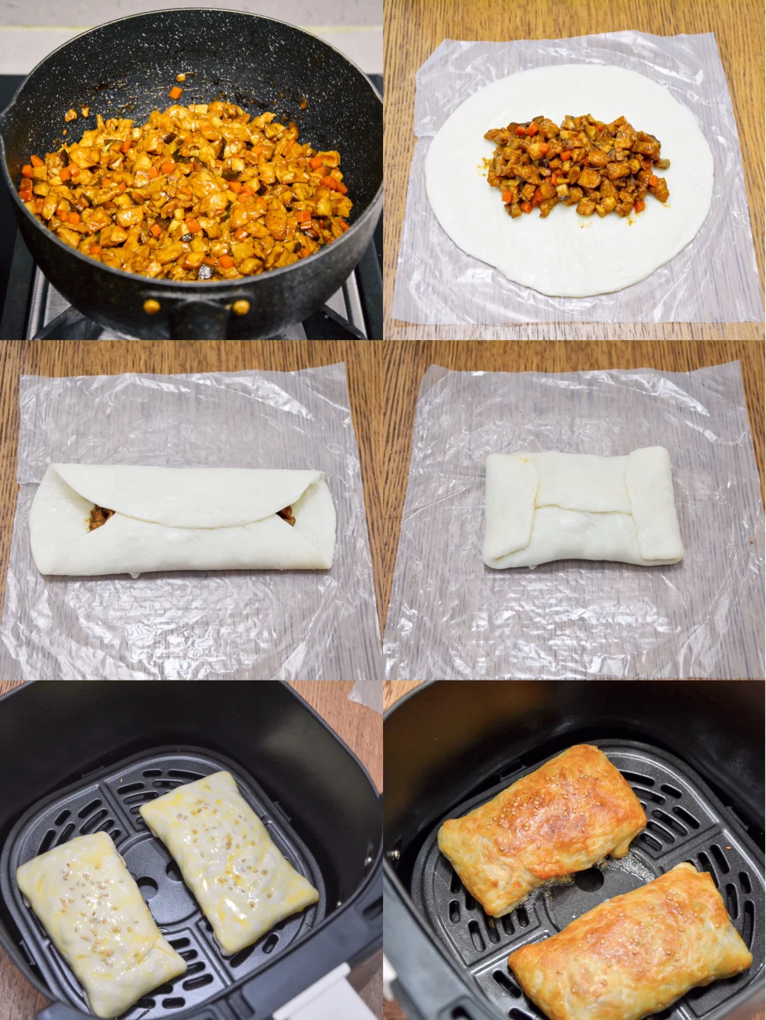 用手抓饼包裹住炒熟的香菇鸡胸肉,再用空气炸锅烤一烤,哇,酥脆香软真好吃。 【材料】鸡胸肉250克,香菇150克,胡萝卜100克,手抓饼5张 【调味料】 生抽10克,老抽5克,盐1克,葱末10克,黑胡椒海盐1克,生姜粉2克,玉米淀粉5克,植物油10克 【装饰】 鸡蛋液少许,白芝麻少许 【数量】 5个 【烘烤】 空气炸锅,180度,15分钟 【做法】 鸡胸肉切丁,放调味料腌制15分钟左右入味; 入锅炒熟,加入香菇丁、胡萝卜丁,炒匀即可; 用手抓饼包裹住,表面刷鸡蛋注,空气炸锅烤熟即可。