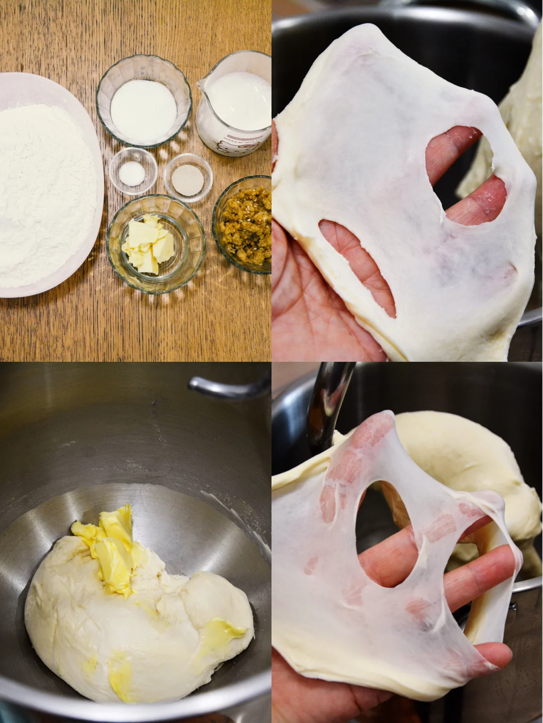 1. 面团材料打出粗膜后加入黄油,打出透明有弹性的薄膜;