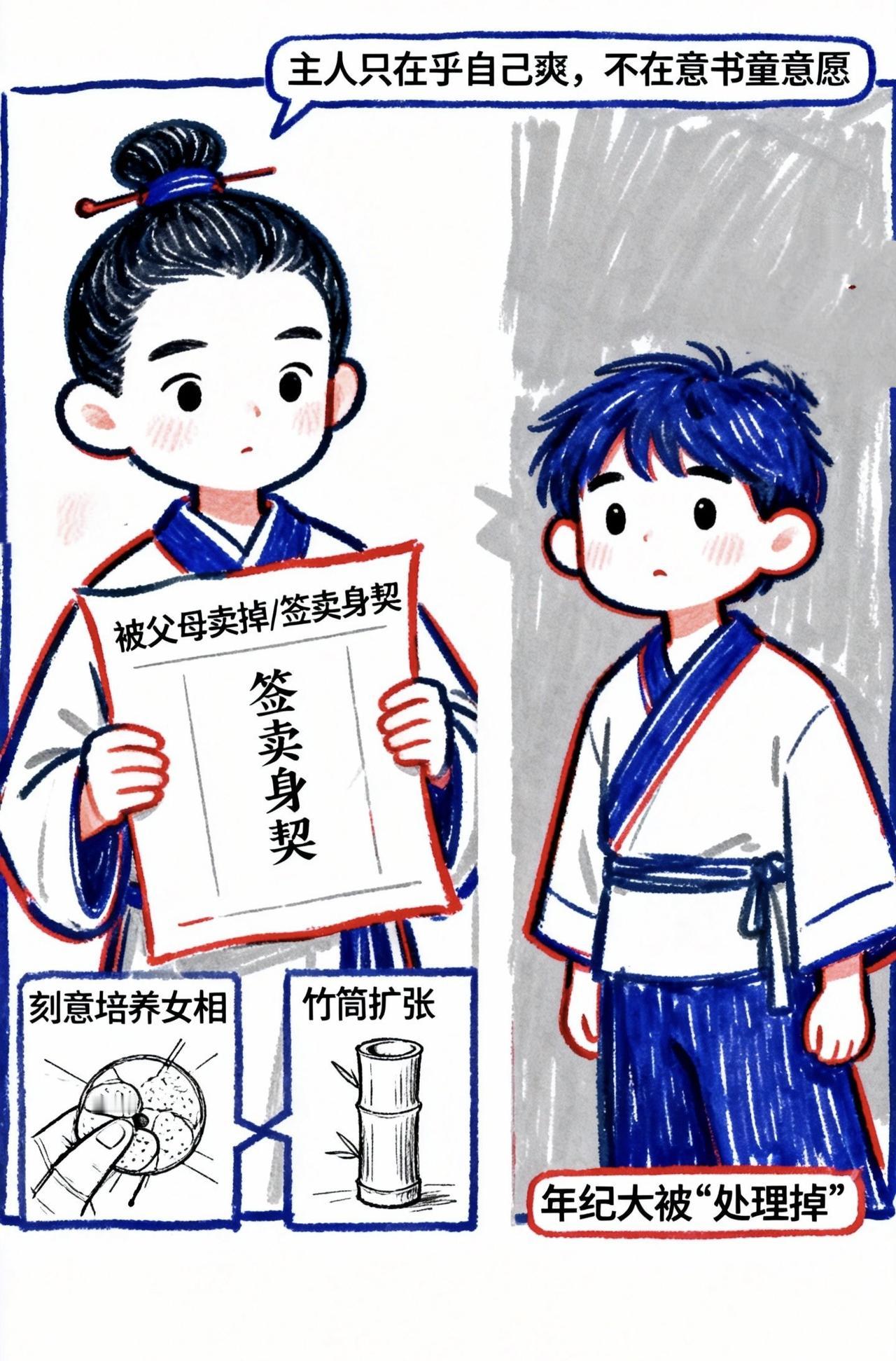 你以为古代书童只是帮少爷背书包、磨墨的小跟班?大错特错! 那些看着模样清秀的小跟班,背后藏着颠覆你的认知,暖床、解闷、甚至充当特殊伴侣,这背后的野史,比你想的刺激多了! 书童的基础操作,确实是帮读书人背书包的。古代科举赶考千里迢迢,笔墨纸砚、书籍行李一堆,读书人肩不能扛手不能提,全靠书童一路打理。寒窗苦读时,书童要磨墨铺纸、抄书整理,甚至还要陪读背书,堪称全能后勤+学习搭子。 有网友扒出“太尉高俅、神霄派祖师林灵素,都做过苏东坡的书童”。 但这只是表面功夫,书童最隐藏功能,是帮少爷暖床+解压!古代没有电热毯,寒冬腊月里,书童得比少爷早一两个时辰上床,用身体把冰冷的床铺捂热,等少爷就寝时,要么被赶下床,要么继续留下陪伴。 你可能会问,寒窗苦读压力大,为啥不用丫鬟?这就不得不提古代盛行的断袖之风,汉朝皇帝大多有这癖好,明清更是有专门的男宠市场,上层人家养男宠还互相攀比,父母根本不计较性别。 更关键的是,书童比丫鬟实用多了!男童没有生理期,不会怀孕,不用担心意外麻烦,丫鬟一月顶多出勤21天,书童能全勤30天,还能兼顾力气活,简直是全能型工具人。 网友:“上京赶考带个书童,既解决需求又没后患”。 明清小说里早写透了,《红楼梦》中贾宝玉见秦钟似有女儿之态,便痴了半日,两人在学堂里形影不离,引得同窗流言蜚语;薛蟠更是直接假上学,就为了在学堂里找香怜、玉爱这些清秀子弟满足龙阳之兴,书童的特殊作用,早就不是秘密。 这种现象还被写进了正史和野史,《阅微草堂笔记》记载“有书生嬖一娈童,相爱如夫妇”,郑板桥的小童王凤因貌美性敏深得喜爱,清朝甚至有狎优之风,官吏不能狎妓,就招20岁以下的优伶陪酒唱曲,这些优伶被称为娈童,本质就是上层阶级的特殊玩物。 更离谱的是,有些人家还会给16岁左右的公子安排契兄弟,年纪稍长的男子同吃同住如夫妻,娶妻后要么分开要么继续,对方结婚时还要出娶妻费用,这在当时居然是公开的习俗。 为啥这种现象能盛行?核心还是欲望压制和阶级特权。古代男女授受不亲,异性交往被严格限制,上层官僚、富商、文人骚客没处发泄,就把目光投向了清秀男童。 而且书童大多是签下卖身契,或是从小被父母卖掉的,主人家根本不在意他们的意愿,只在乎自己爽不爽,不会照顾到书童。 这些孩子被当成玩具,从小被刻意培养成女相,甚至有明清时期用竹筒扩张肛门的残酷做法,就为了满足主人的变态需求。 网友说得扎心:“等少爷娶妻生子,书童年纪大了,就会被随便‘处理掉’”。 他们没有人身自由,一辈子身不由己,看似跟着读书人沾了点文气,实则活在最底层,连基本的尊严都没有。 你以为古代书童还有哪些隐藏作用?评论区聊聊你知道的野史秘闻~