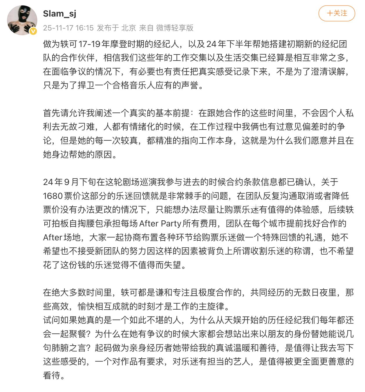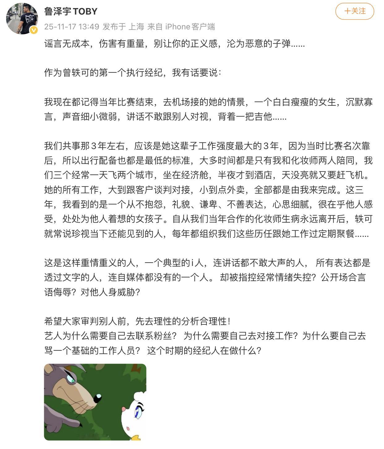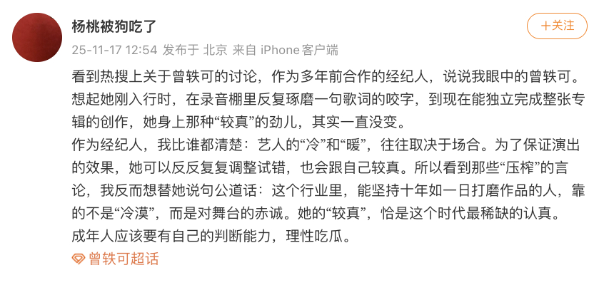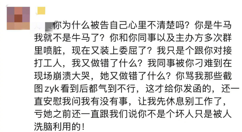 曾轶可前任助理发博爆料曾轶可工作耍大牌,还曾被职场霸凌要求道歉,结果道歉没等来,等来的却是举报投诉和律师函,打工人真的狠狠共情了!当事人不出来自己回应,反而是另一群打工人出来对质,联合网暴一个小女孩真的应该吗?而且人家从头到尾也就只是想要一个道歉,现在反而被扒出了之前各种下头的行为,闹的这么大也是得不偿失了。u1s1出来这么多经纪人,谁来认领一下最后一张图里的活动啊!