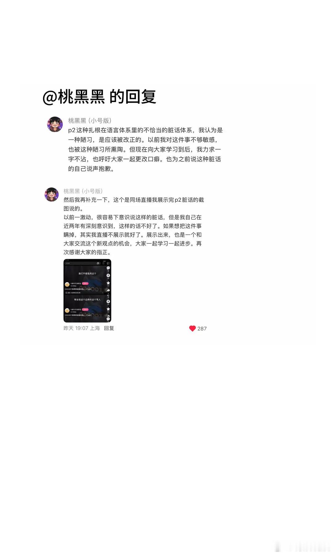 桃黑黑回复受众大多为女还使用辱nv词的争议,依旧超长小作文.