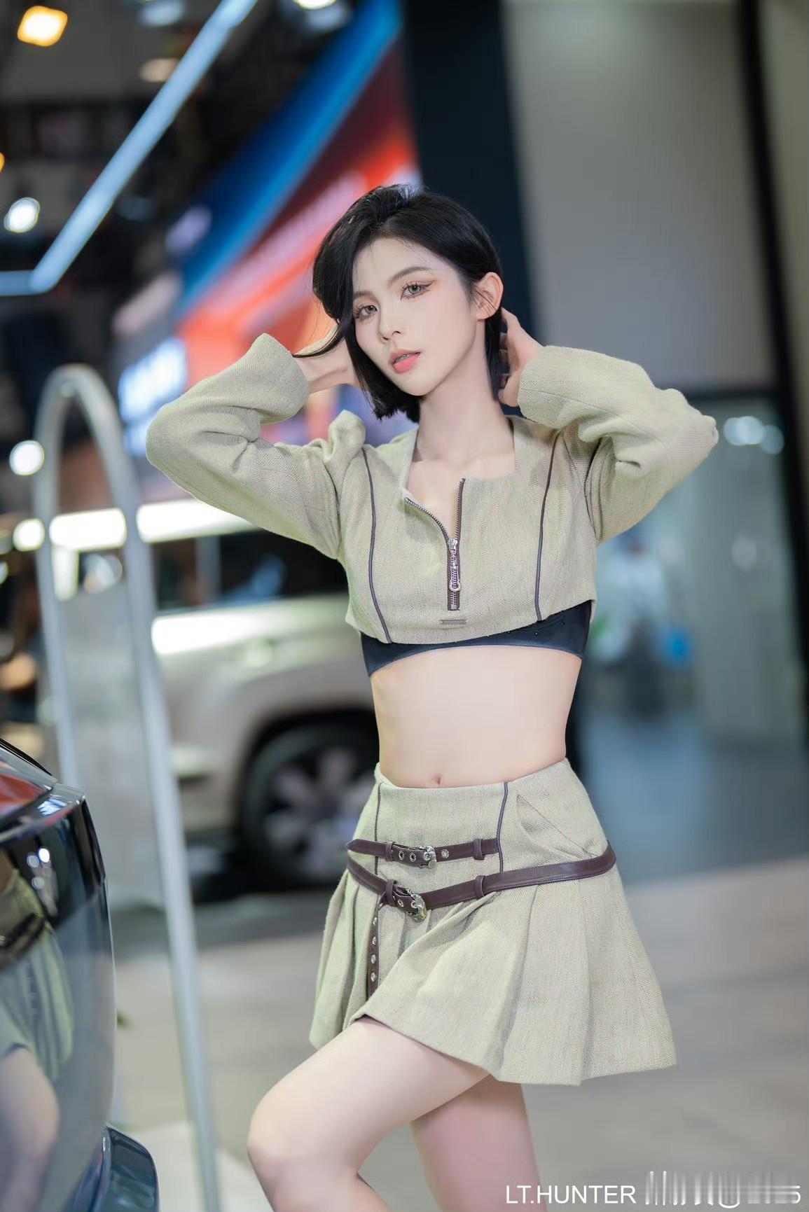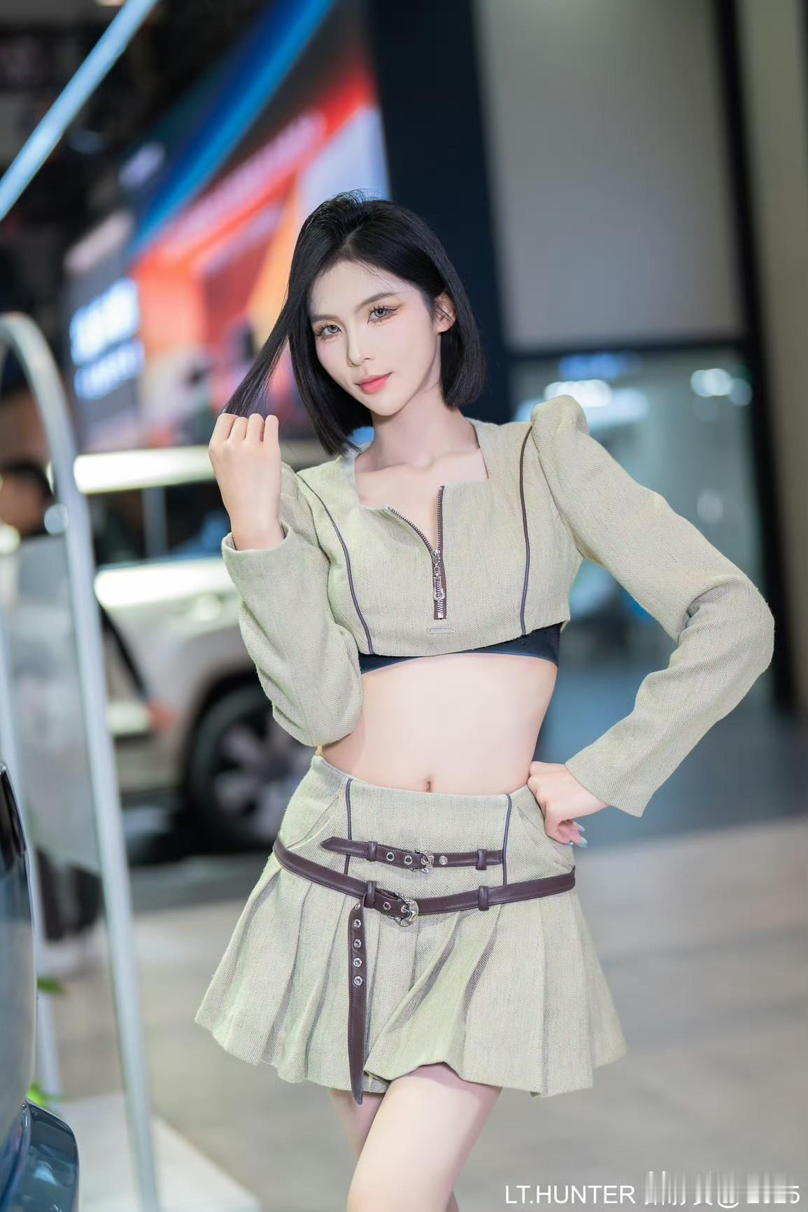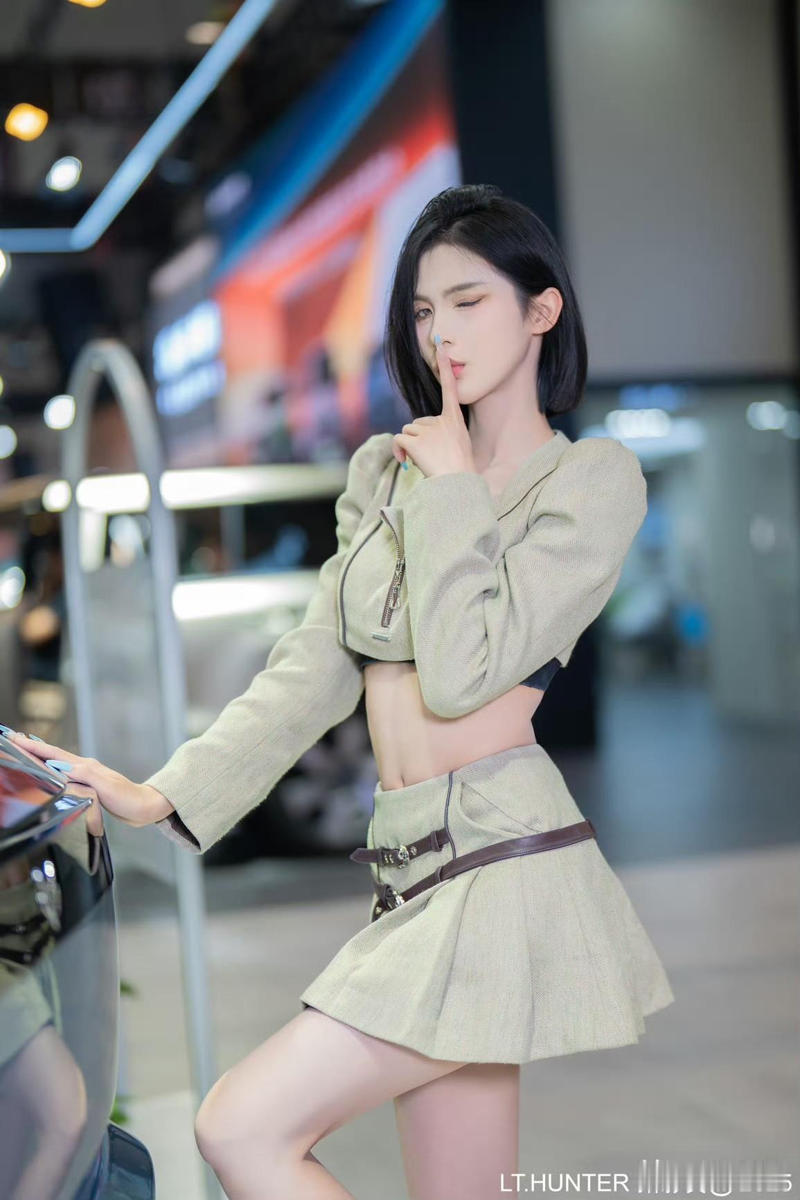 东莞车展车模“傻猪”,黑色紧身上衣配豹纹短裙,鹅蛋脸可爱到极致,有些“傻白甜”的