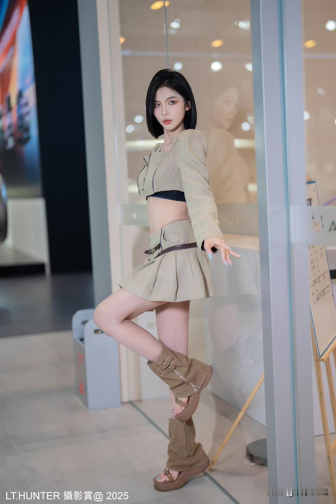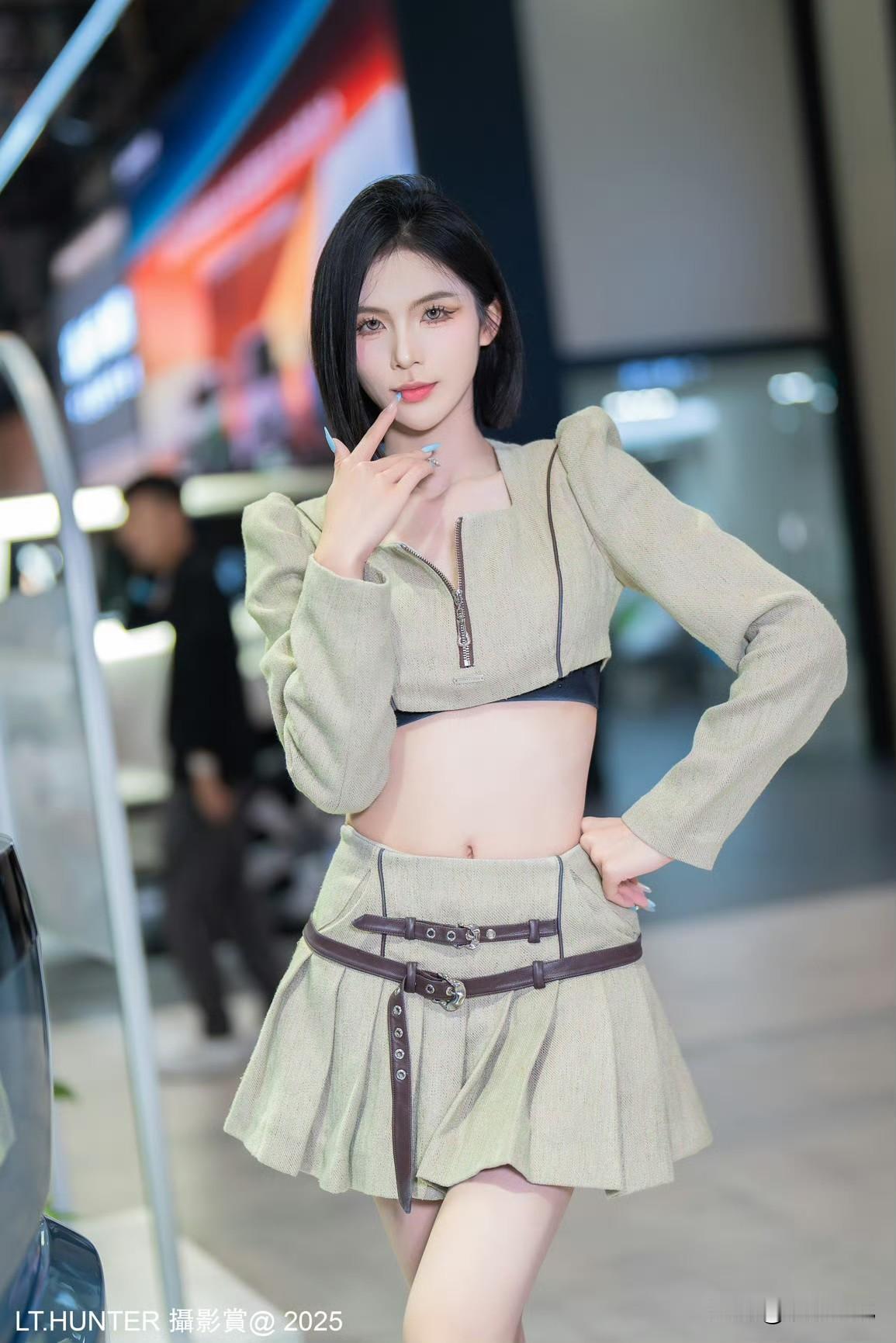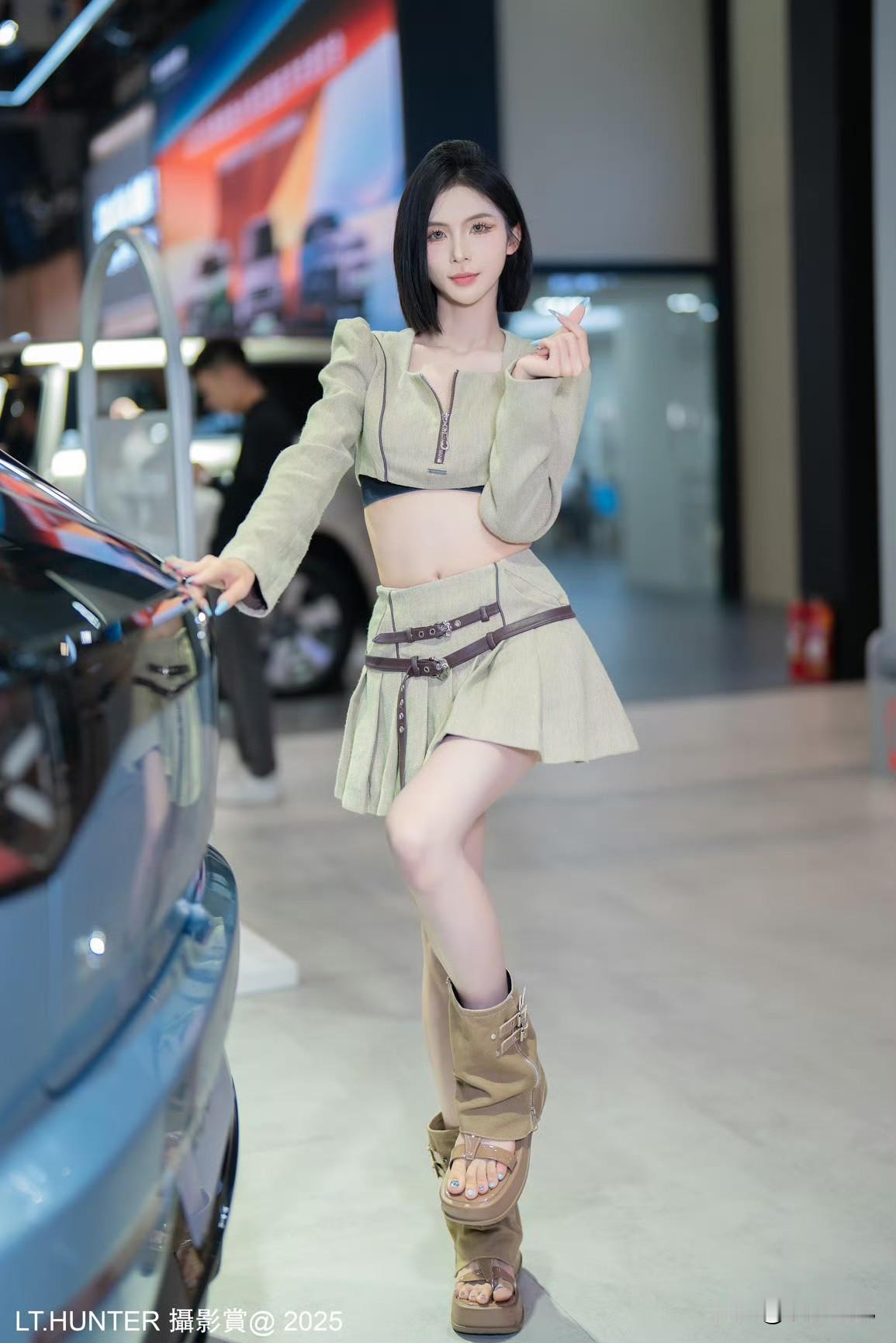 东莞车展车模“傻猪”,黑色紧身上衣配豹纹短裙,鹅蛋脸可爱到极致,有些“傻白甜”的