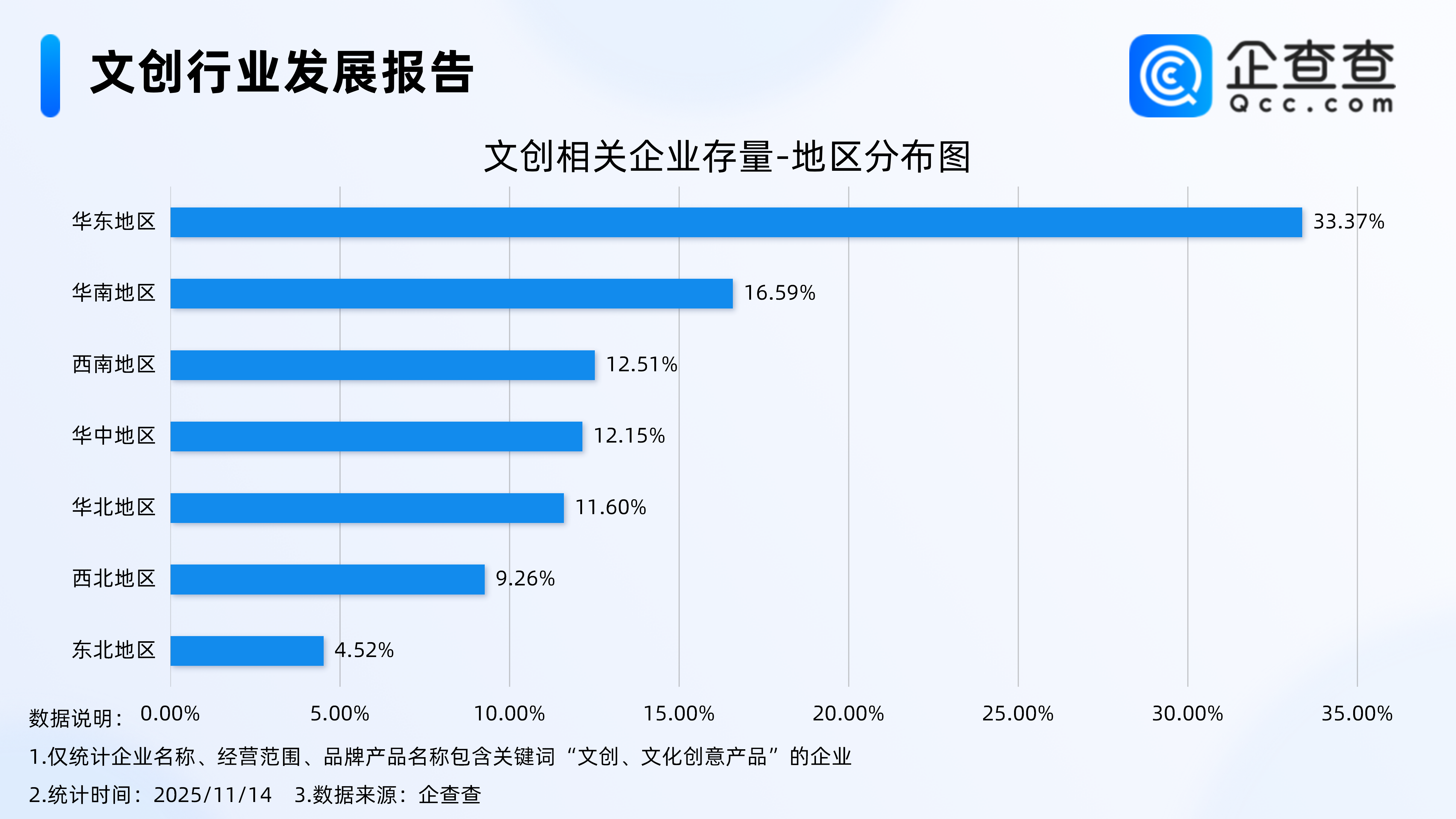 企查查数据显示,截至11月14日,国内现存文创相关企业3.11万家。从地区分布来看,文创相关企业主要集中分布在华东地区,占比达33.37%。其次,分布在华南地区、西南地区的文创相关企业分别占比16.59%、12.51%。