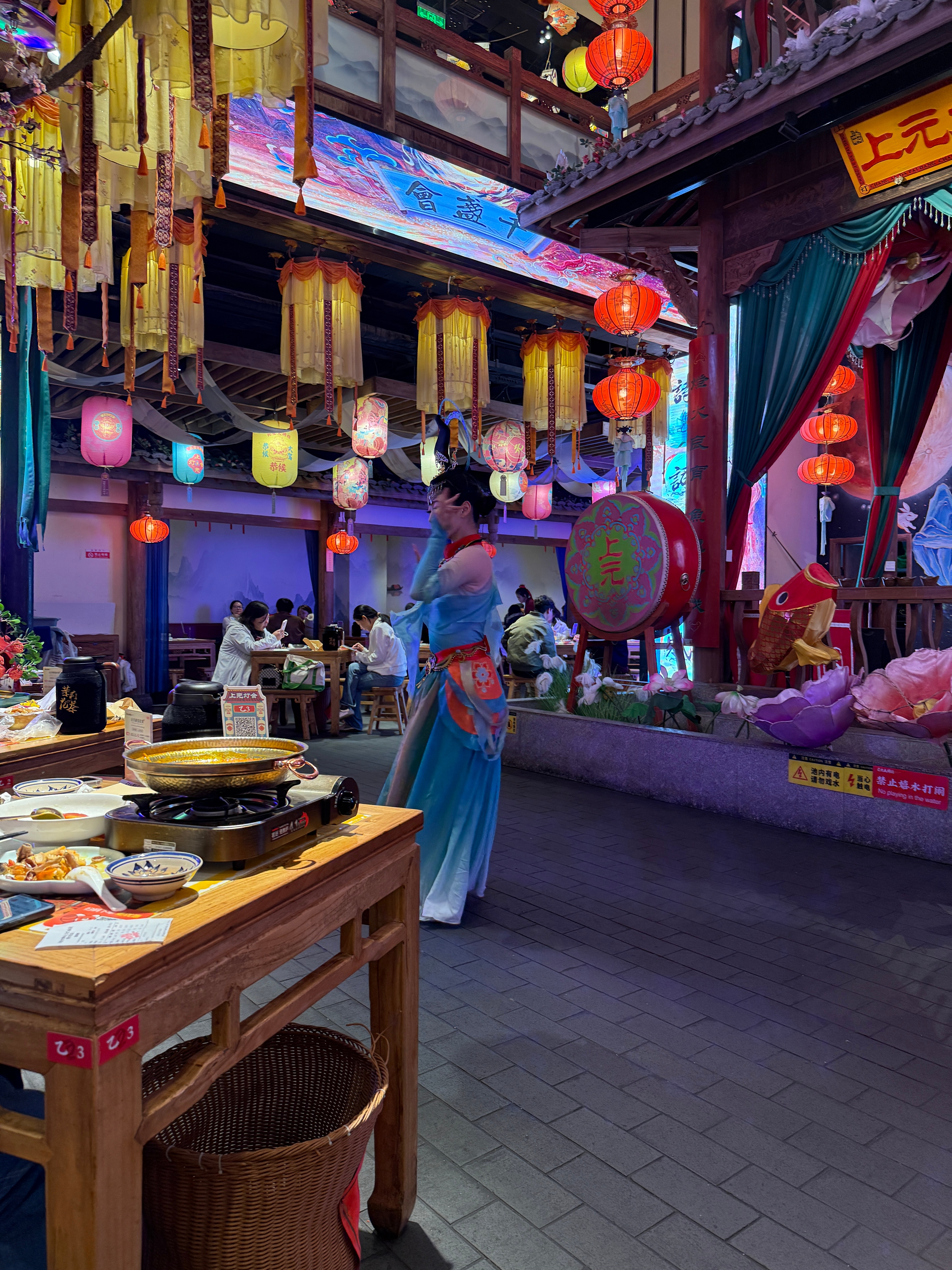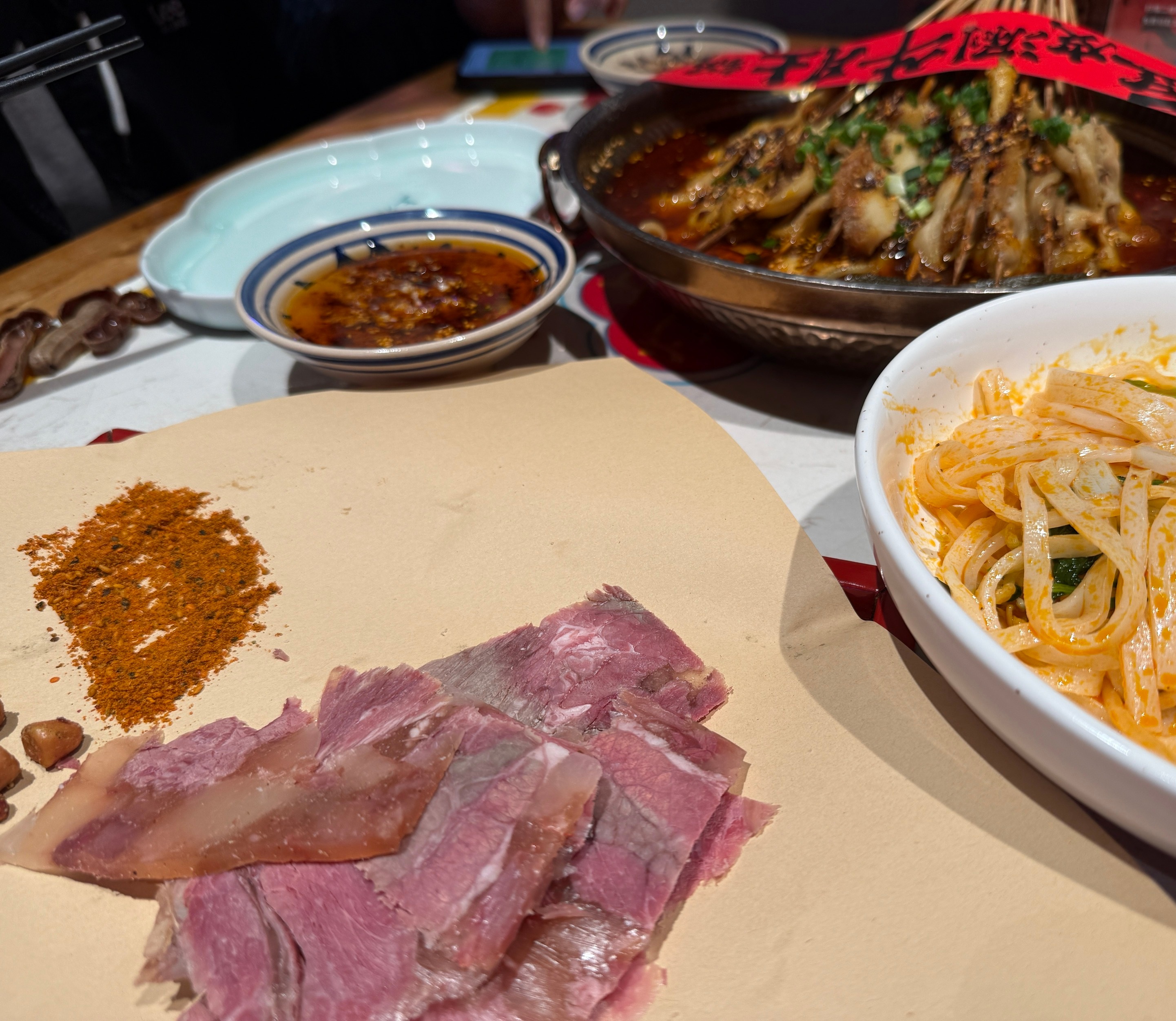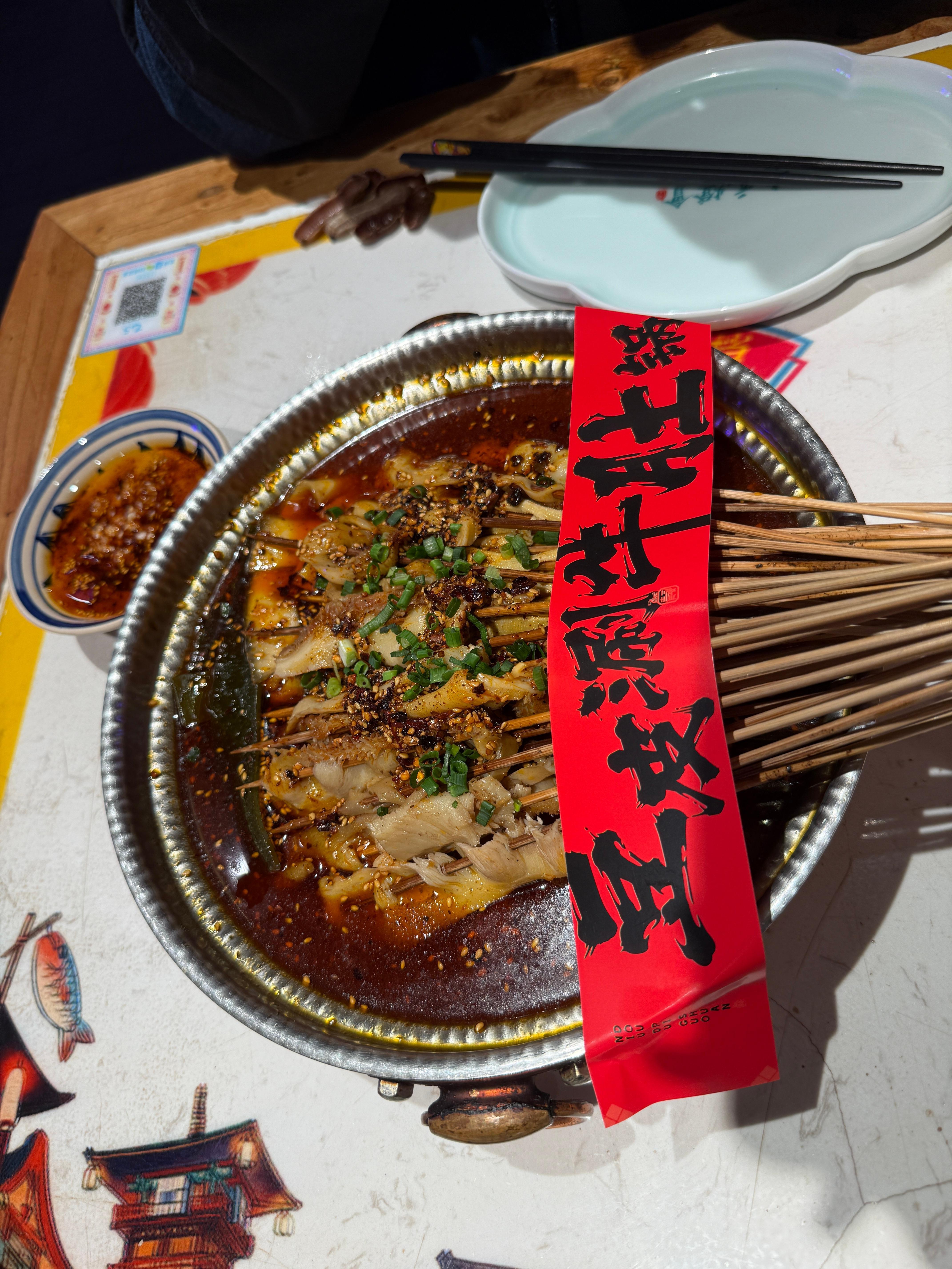 城墙下的烟火江湖,一口吃透长安夜进门之后,不用讲究排场,找张木桌坐下,倒上一碗茶。点上一盆毛肚,豆皮涮牛肚锅咕嘟冒泡,薄嫩的豆皮和弹牙的牛肚吸饱卤汁,麻香醇厚,一口一串停不下来。大排档的碳水灵魂,非面莫属!比脸大的老碗端上来就气场十足,宽如裤带的面条裹着红亮红油,是师傅三揉三醒后摔打扯拉而成,筋道弹牙却不硬韧,咬下去满是麦香回甘。这里没有条条框框的约束,穿古装演员偶尔带来一段魔术和舞蹈表演,人均几十就能吃到酣畅淋漓,不仅眼睛观了,味蕾也满足了。西安的大排档,烤的是烟火,煮的是江湖,品的是长安。来这儿不用做复杂攻略,跟着香味走,点上一桌硬菜,在喧闹与热气中,才算真正读懂这座城的味道。