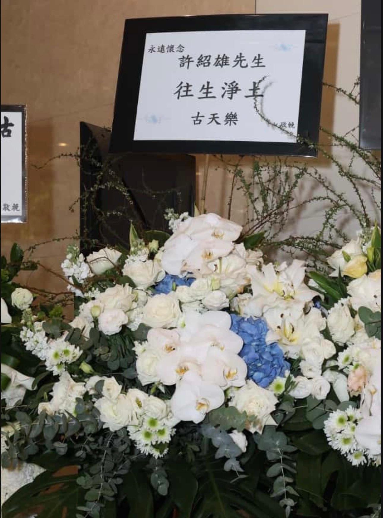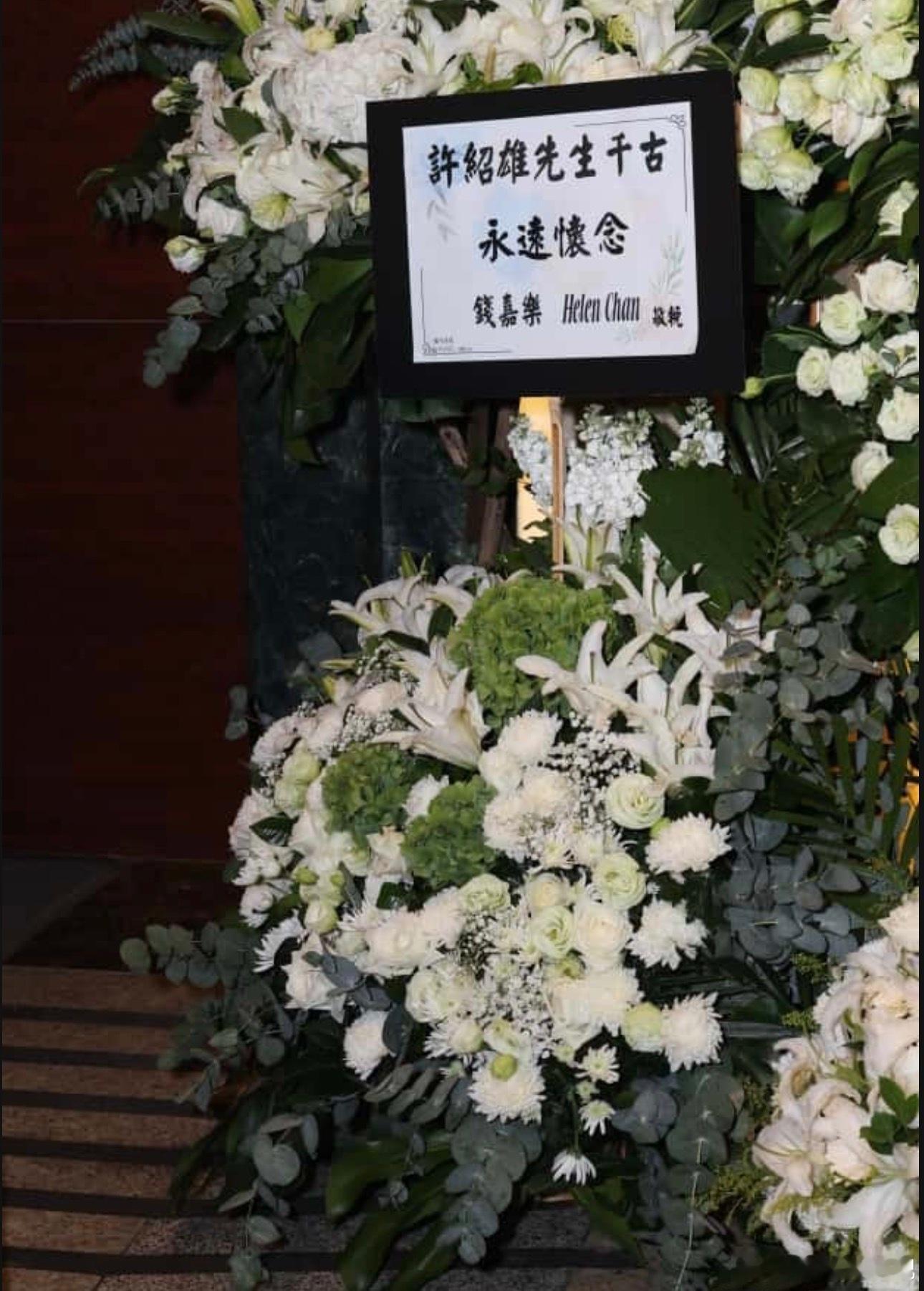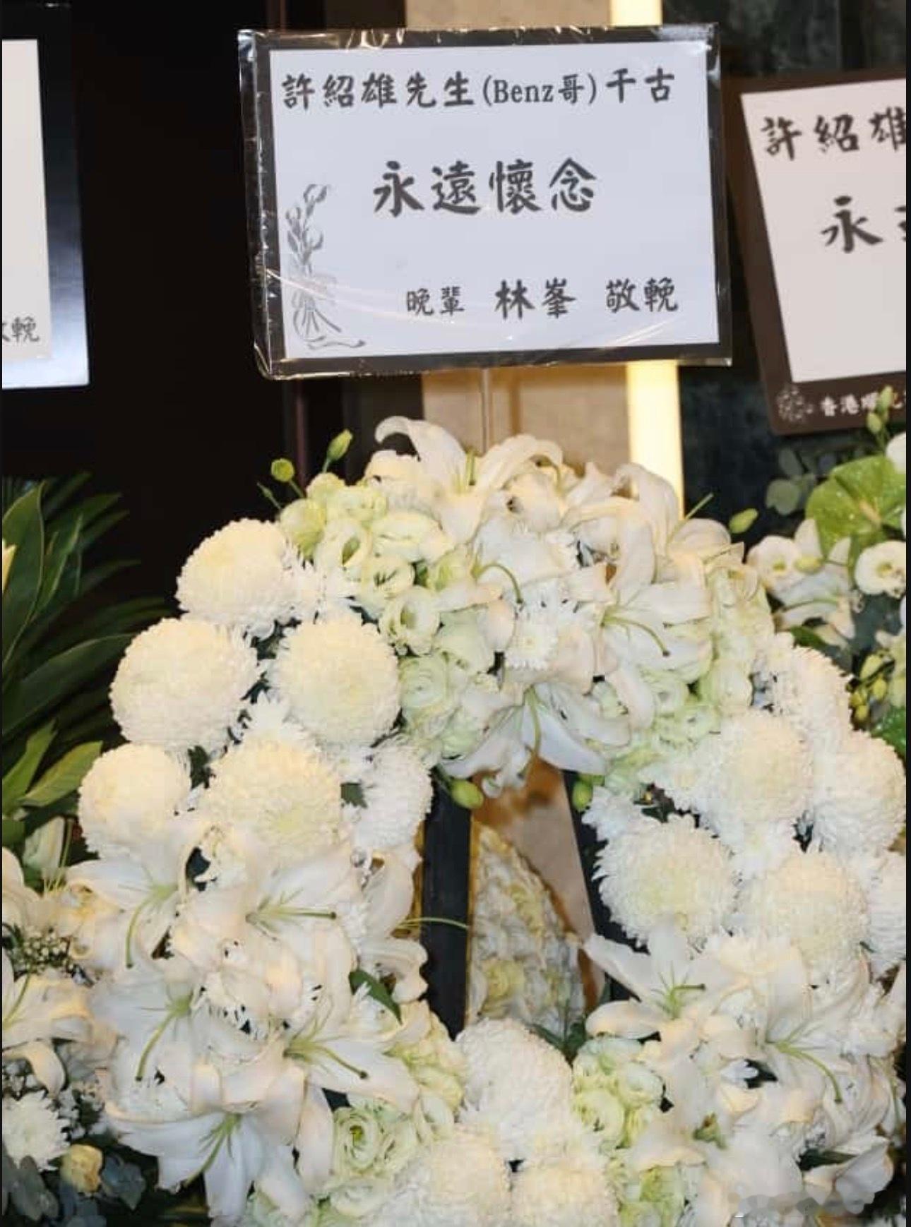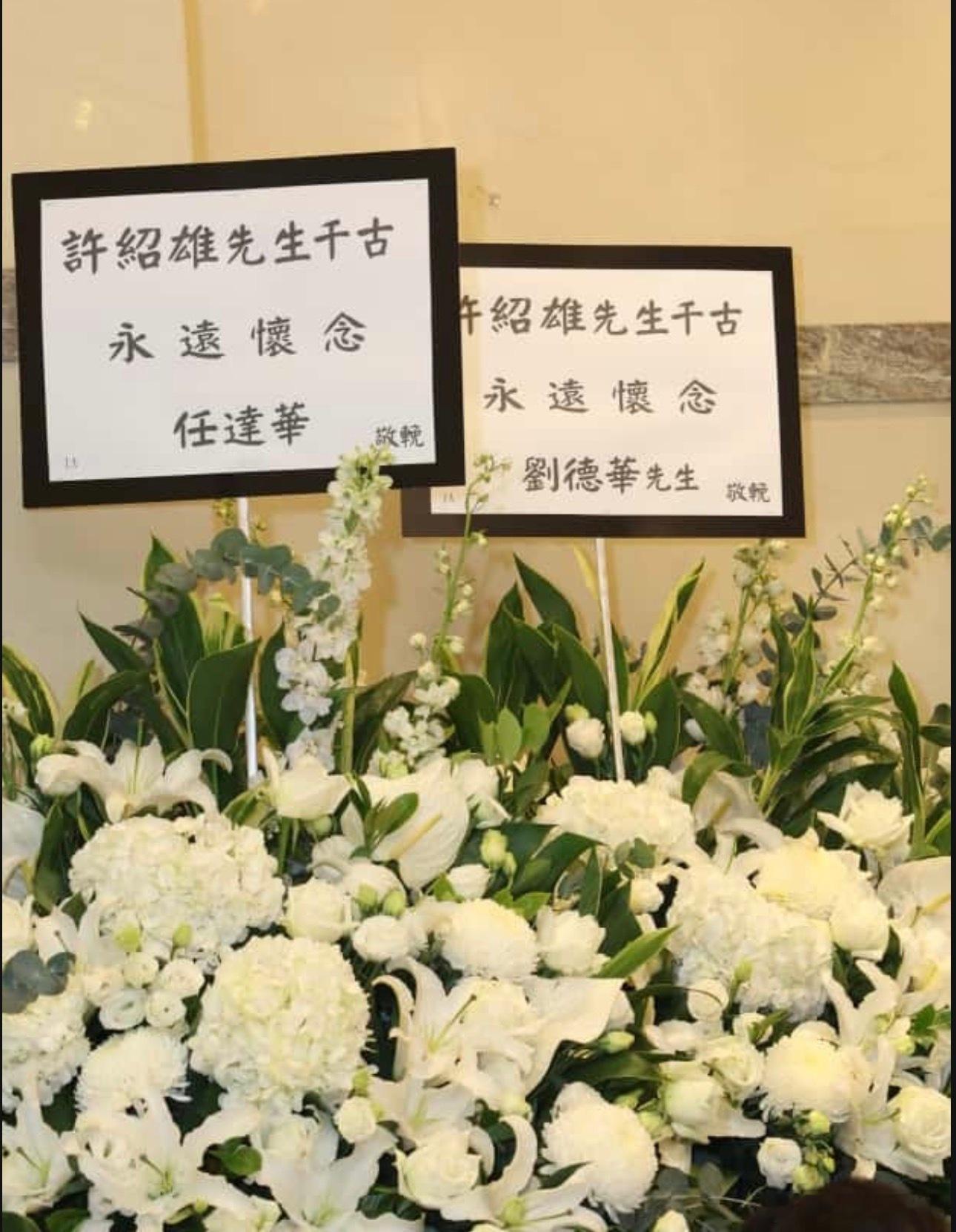 香港艺人许绍雄于10月28日去世,今日举行追悼会,许多圈中好友送上花篮悼念。花篮