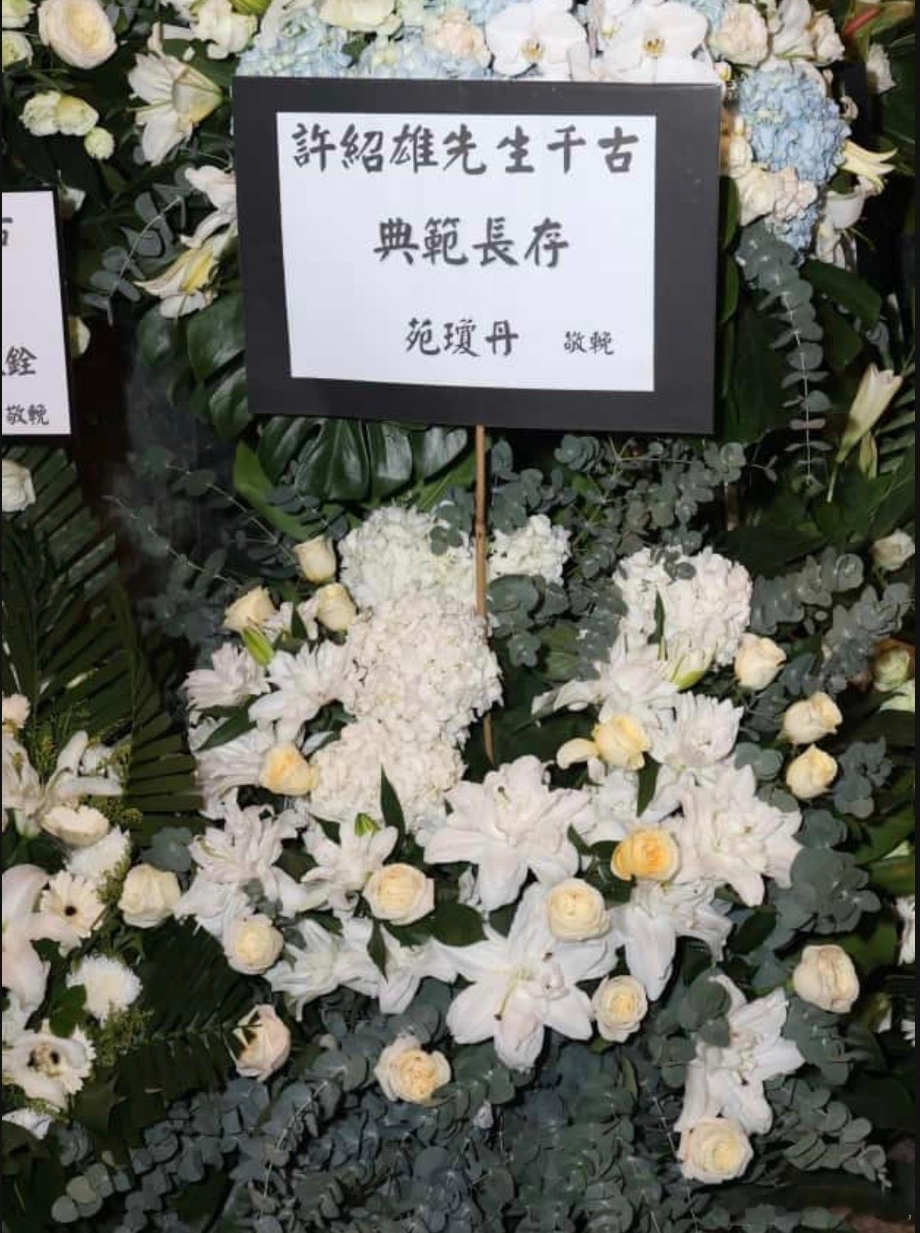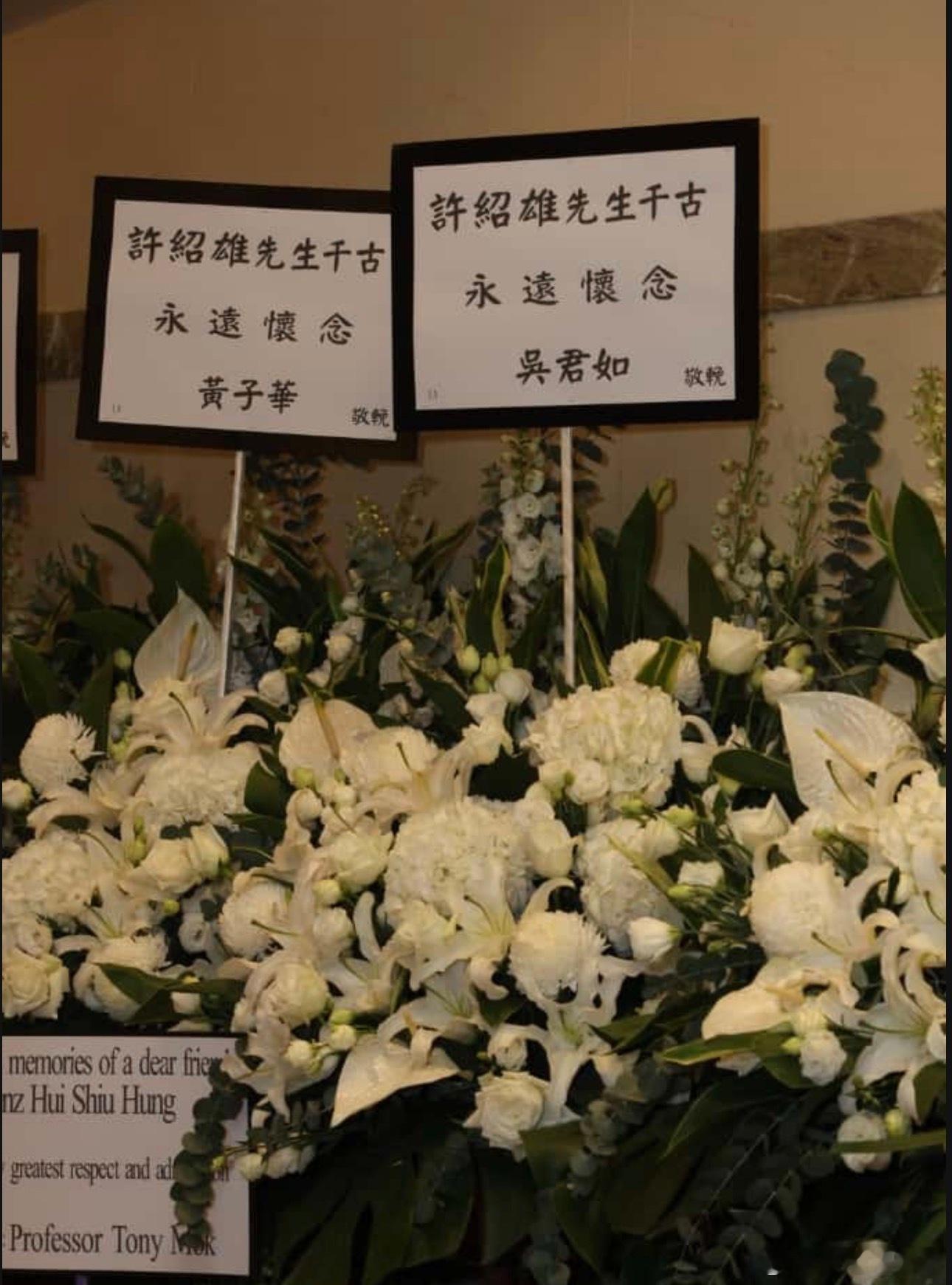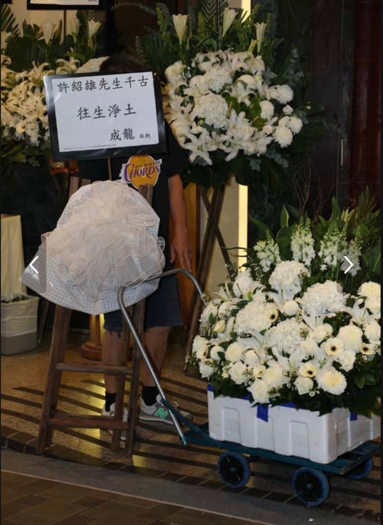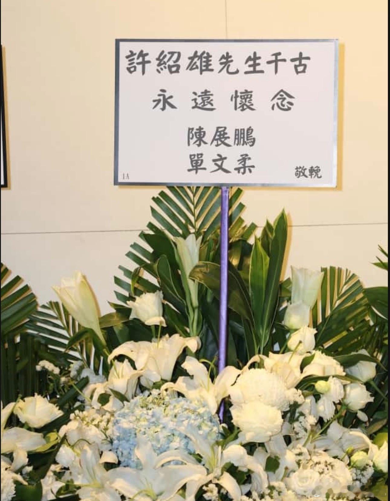 香港艺人许绍雄于10月28日去世,今日举行追悼会,许多圈中好友送上花篮悼念。花篮