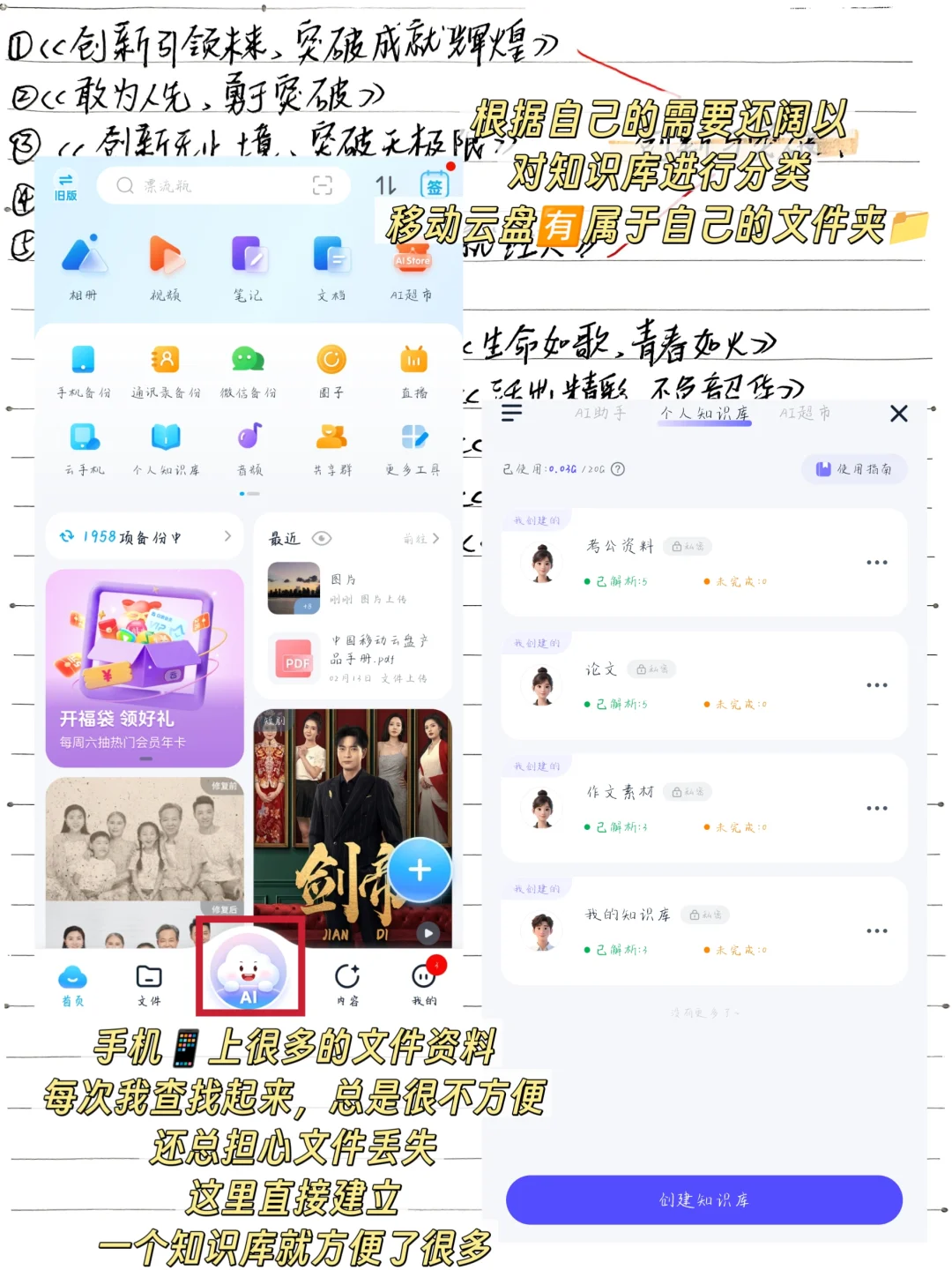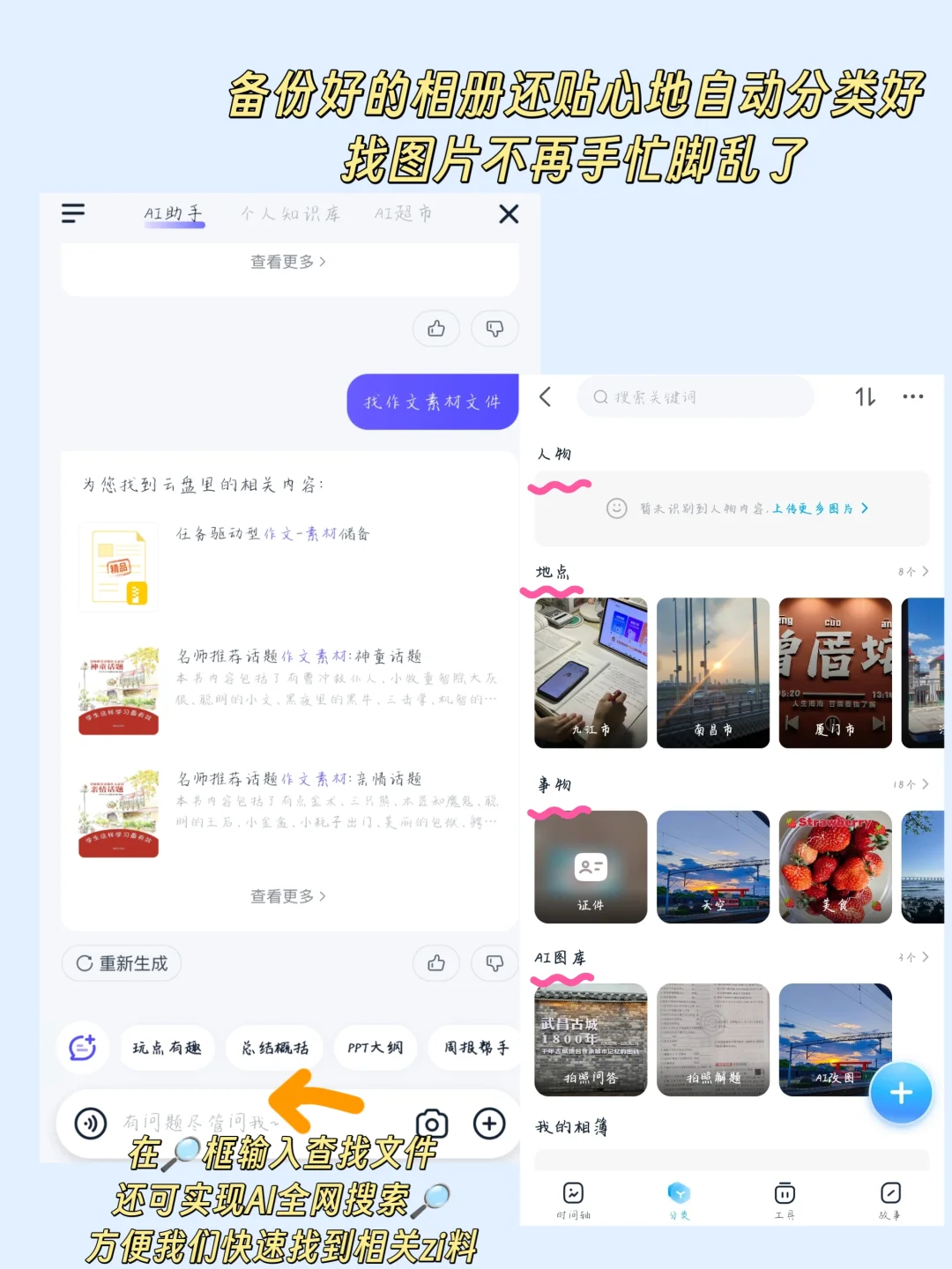 真滴敲级好用,备份资料、照片不卡格式,我手机内存一直不够用,经常要纠结要通过删除哪张照片来清内存,然后前几天偶然发现了这个移动云盘,直接不用纠结了,一键上传,还会帮我们分类好照片,敲细心~