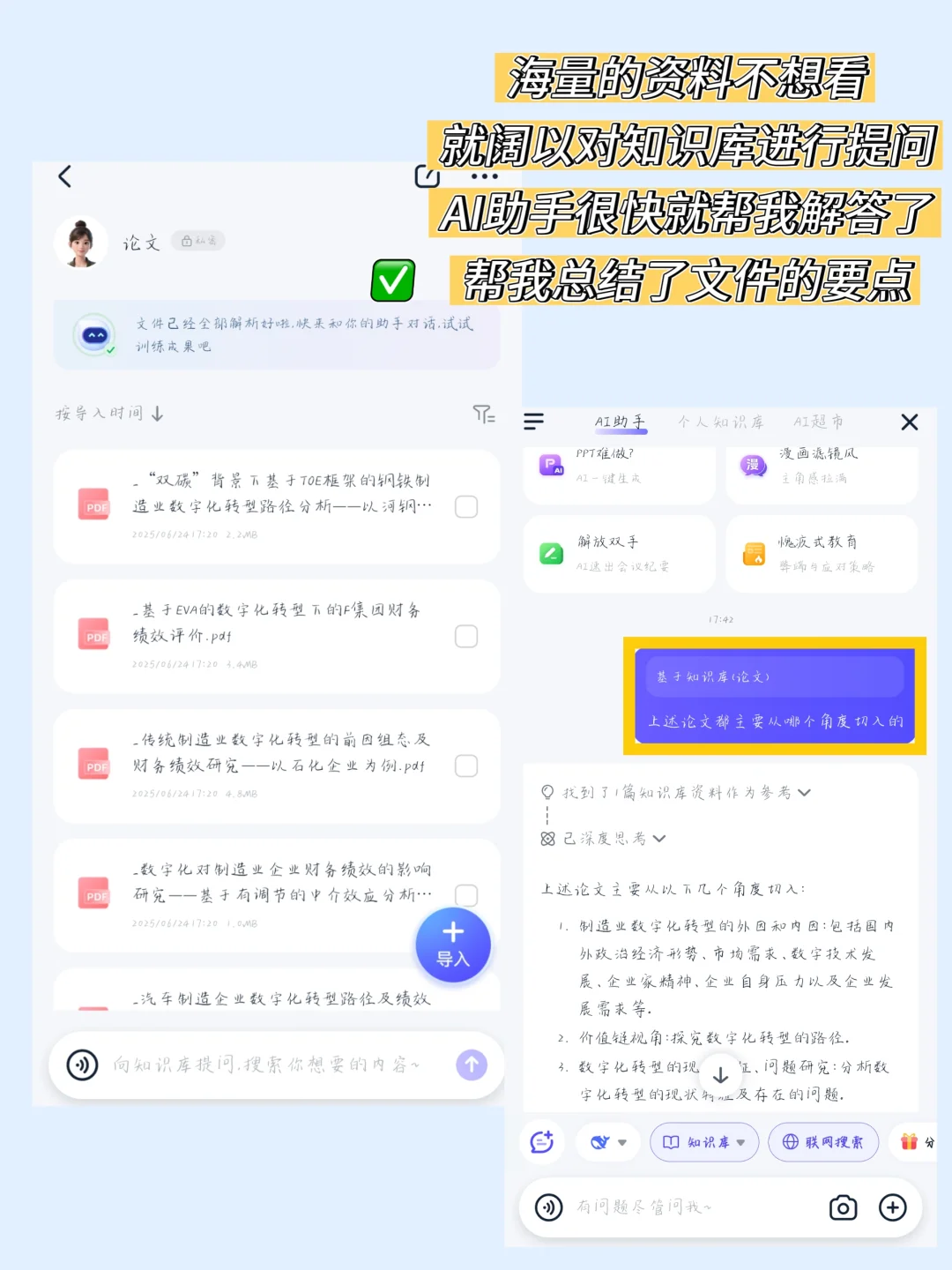 ✅个人知识库-AI高效学习管家把自己的论文、作文素材、考公资料等文件通通上传上去,按照对应类型分类好知识库,想提取考公常考知识点有哪些或者是我的论文可以如何优化等,它都能给出详细的分析建议,简直是对答如流,给我省下了好多翻阅文档资料的时间,不得不说,这个skill真的很实用。