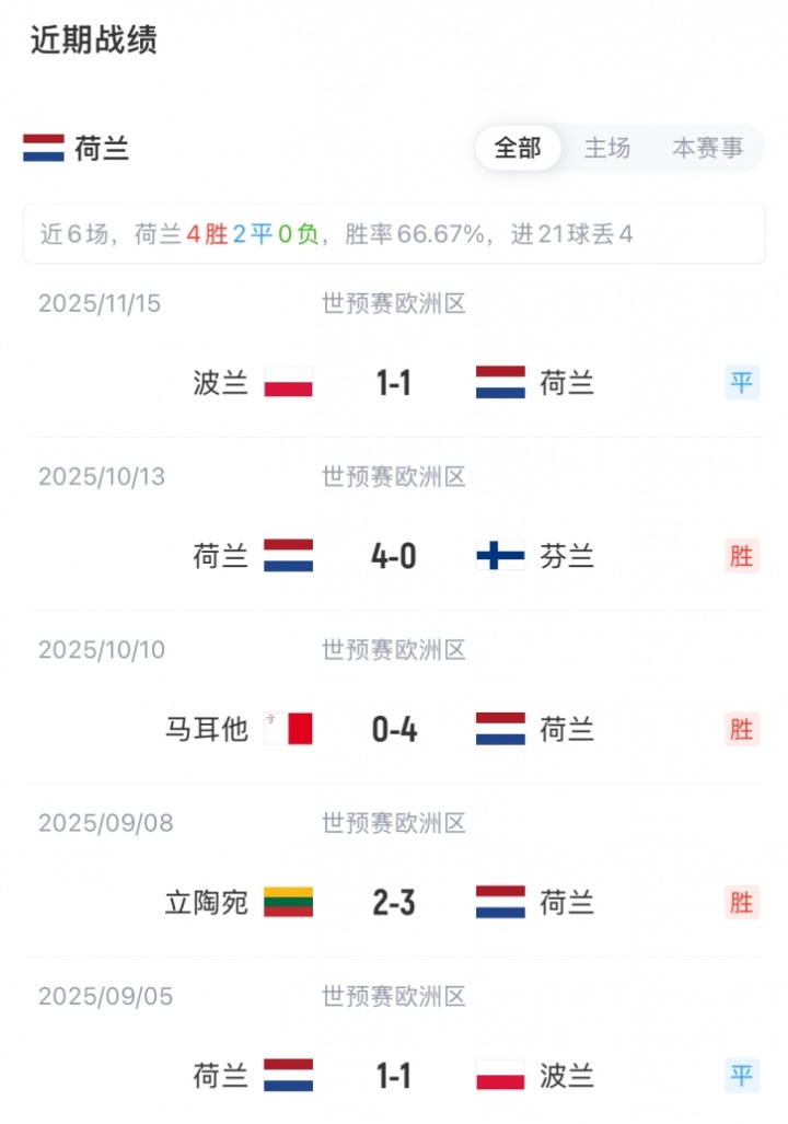 荷兰首发:维尔布鲁根、3-廷伯、5-德里赫特、4-范戴克、5-阿克、14-赖因德斯、7-西蒙斯、21-德容、18-马伦、11-加克波、10-德佩