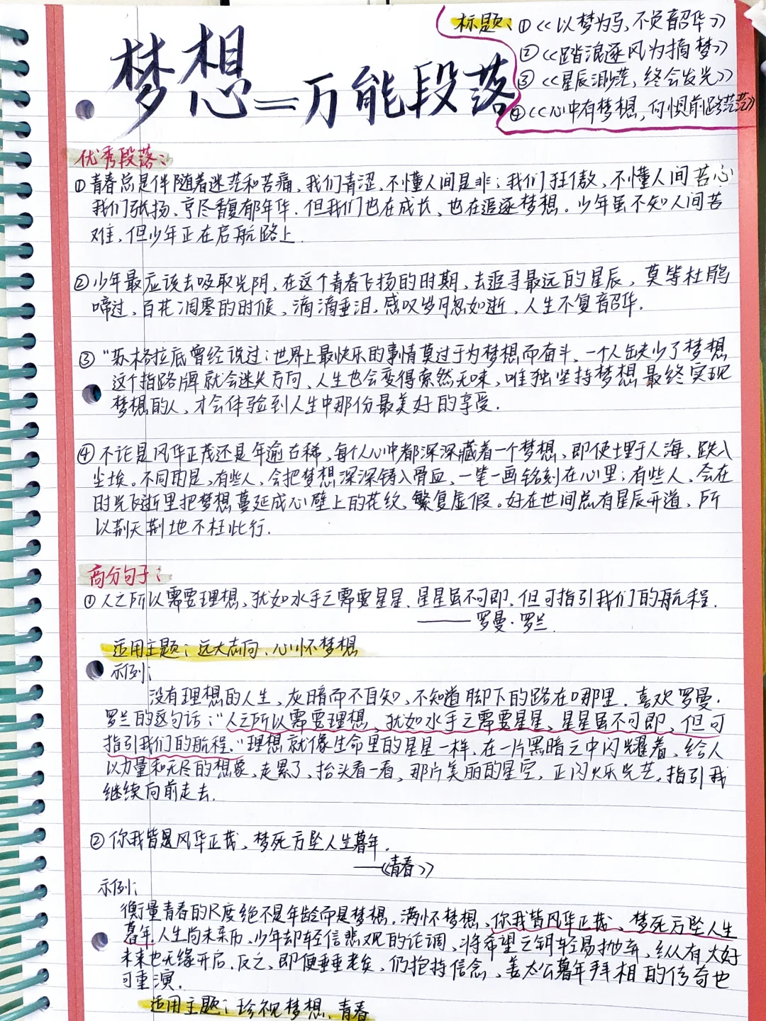 🥣今天带来的是一期有关梦想的作文素材 🗞标题: 《以梦为马,不负韶华》 《踏浪逐风为摘梦》 《星辰渺茫,终会发光》 《心中怀有梦想,何惧前路茫茫》 高分句子: 📩人之所以需要理想,犹如水手之需要星星,星星虽不可即,但可以指引我们的航程。 /罗曼•罗兰 📩你我皆风华正茂,梦死方坠人生暮年。 /《青春》