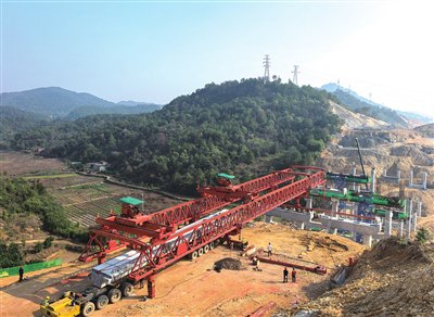 11月17日上午,由中铁十八局集团有限公司承建的上饶广丰稼轩东大道广丰段工程二期一标段青桥大桥,顺利完成首片箱梁架设任务。