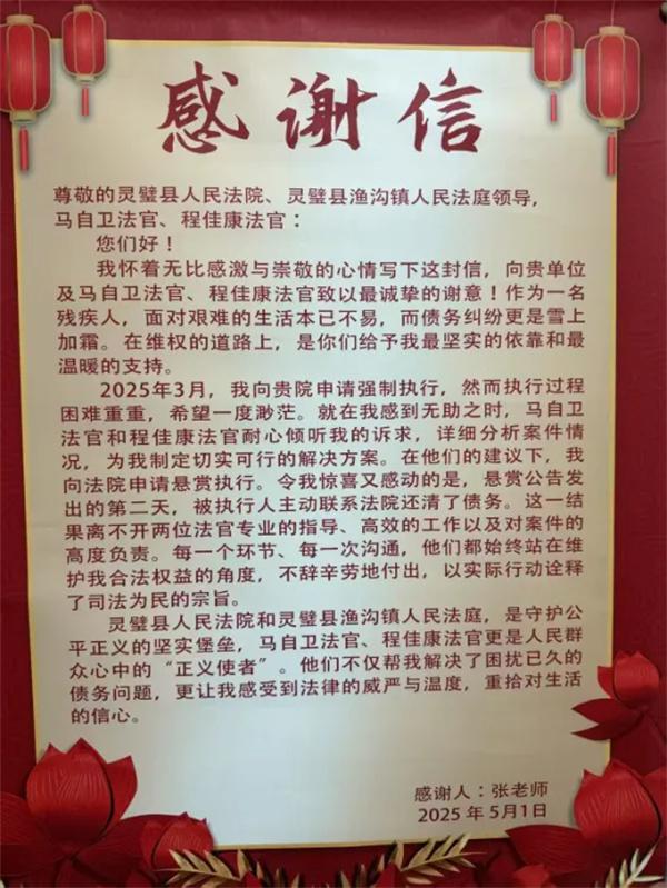 悬赏公告发布的第二天,迫于舆论和法律的威慑,被执行人主动联系法院,表示愿意履行义务。在承办法官的耐心劝解下,被执行人一次性还清全部欠款及利息,案件圆满执结。“灵璧县法院渔沟法庭是守护公平正义的坚实堡垒,不仅帮我解决了困扰已久的债务问题,更让我感受到法律的威严与温度,让我重拾对生活的信心!”申请执行人在赠送的感谢信中写道。