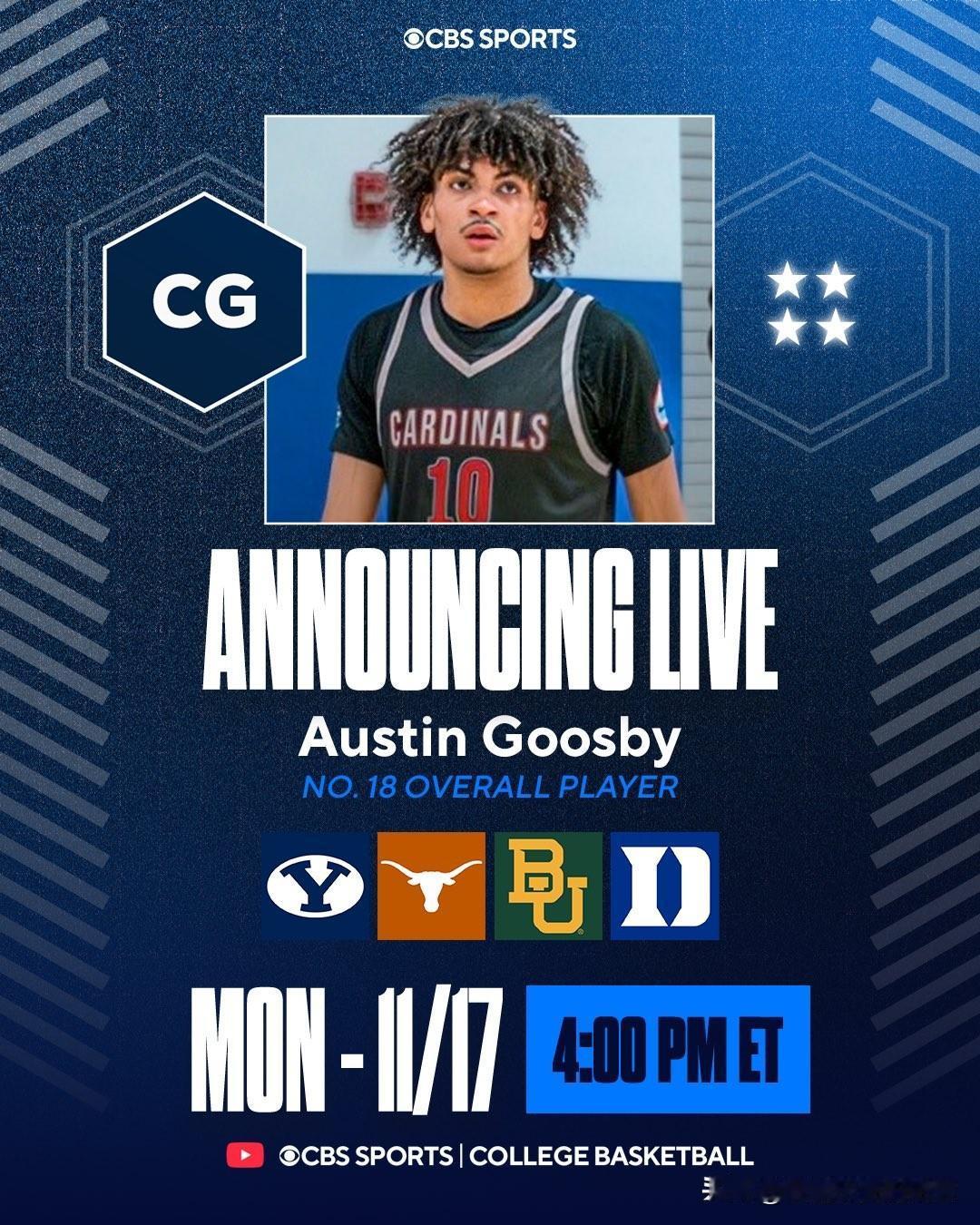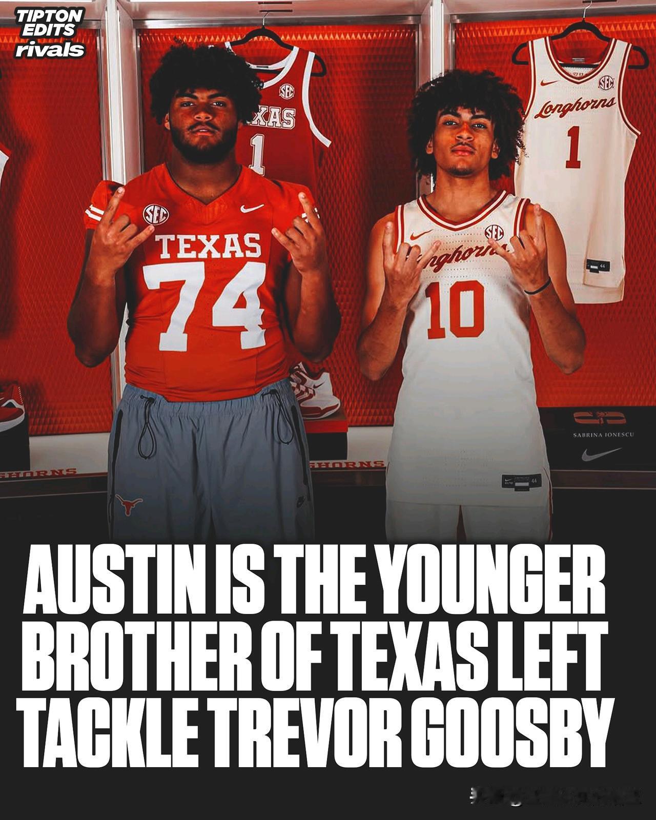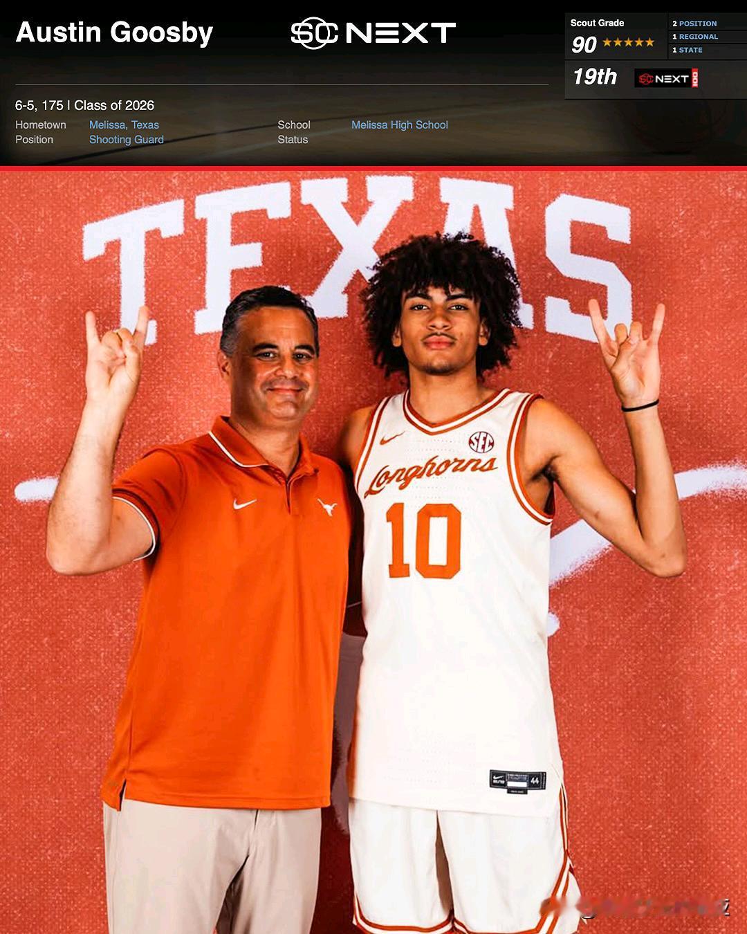 TOP20五星分卫Austin Goosby宣布承诺NCAA男篮 德州大学,哥哥Trevor Goosby则在橄榄球队担任进攻截锋,主帅Sean Miller自2019年以来收到的第一位五星高中生,他透露教练是主要原因,双方一直保持联系,当米勒得到这份工作时,立即就向他伸出了手,想要帮助长角牛赢得全国冠军。