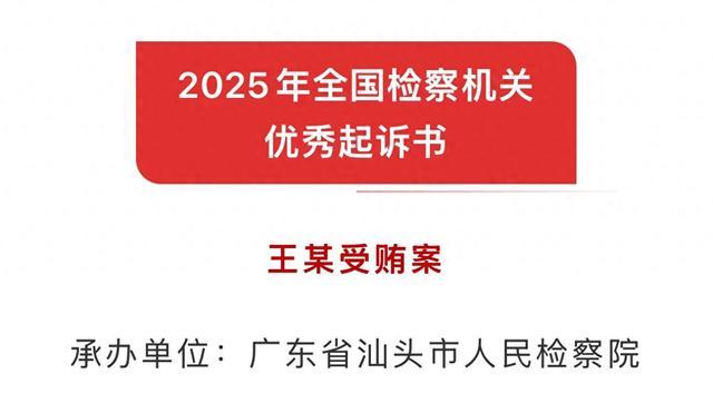 今年5月,最高人民检察院部署举办了全国检察机关优秀起诉书评选活动。经过初评、复评、审定三个环节,近日,最高人民检察院择优评选出100篇“优秀起诉书”和20篇“优秀起诉书提名”。其中,汕头市人民检察院办理的“王某受贿案”起诉书获评“2025年全国检察机关优秀起诉书”。