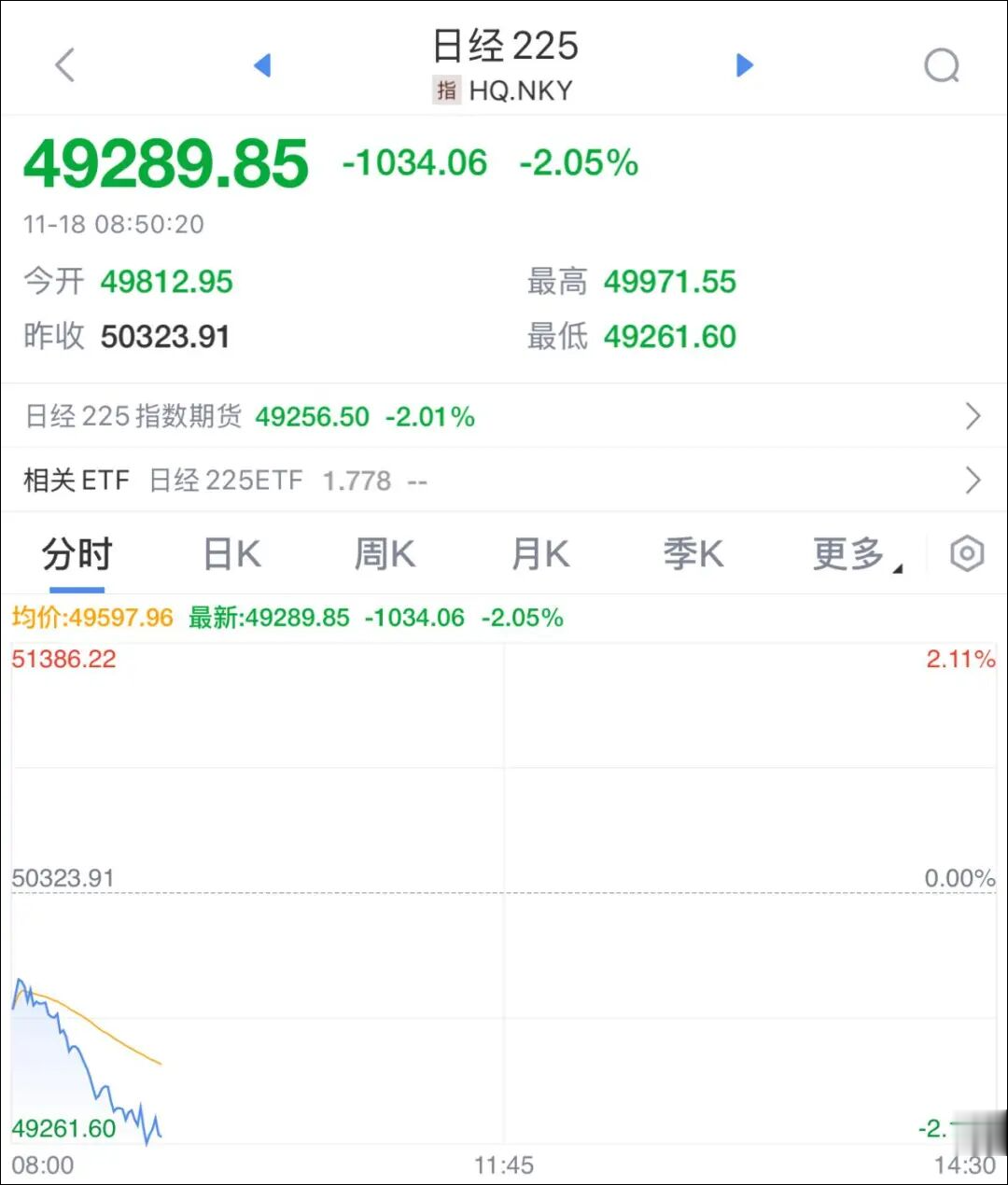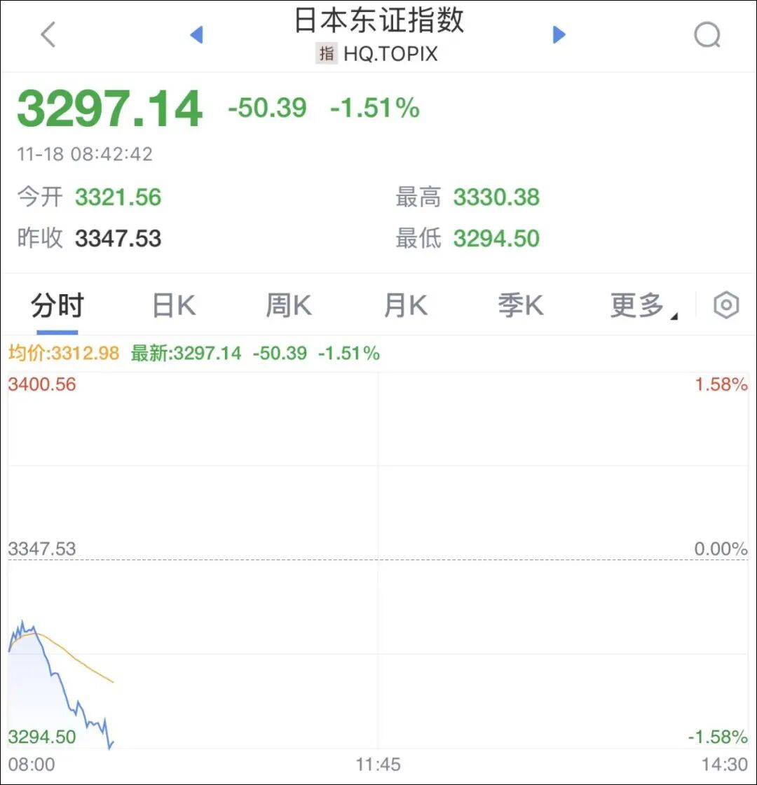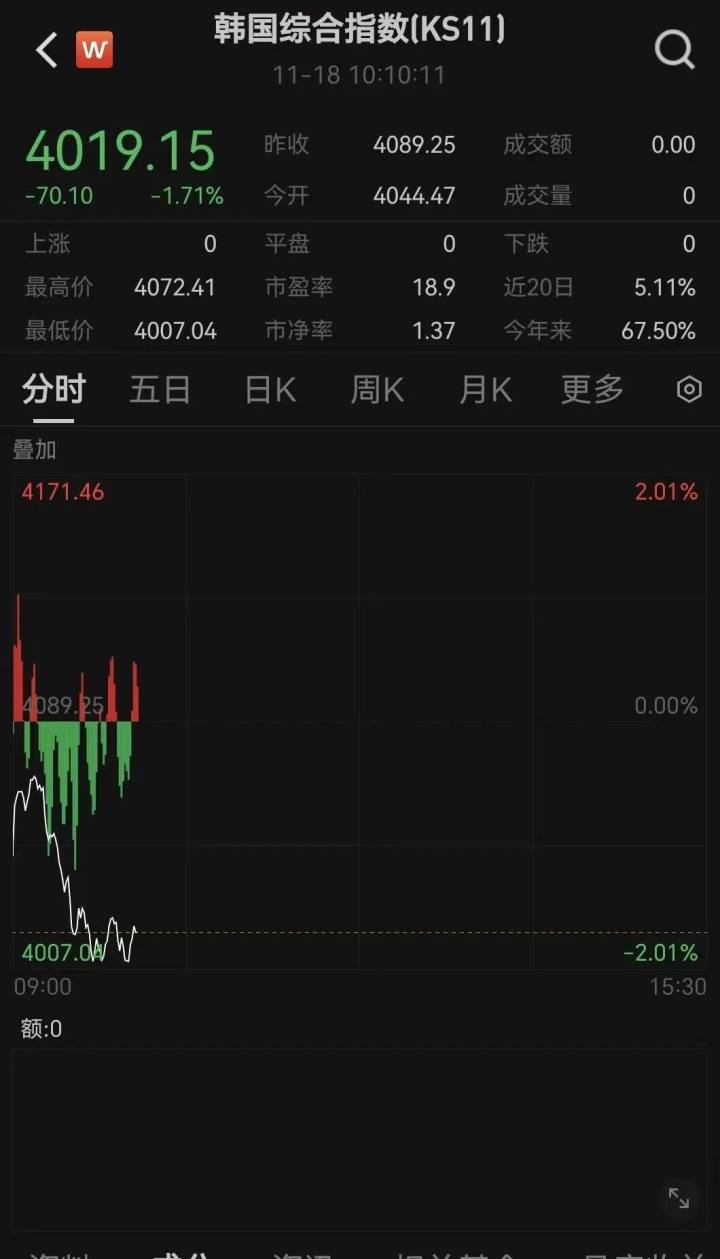 除了日本股市之外,11月18日开盘,韩国股市也显著下挫。截至发稿,韩国综合指数跌幅超1.7%。