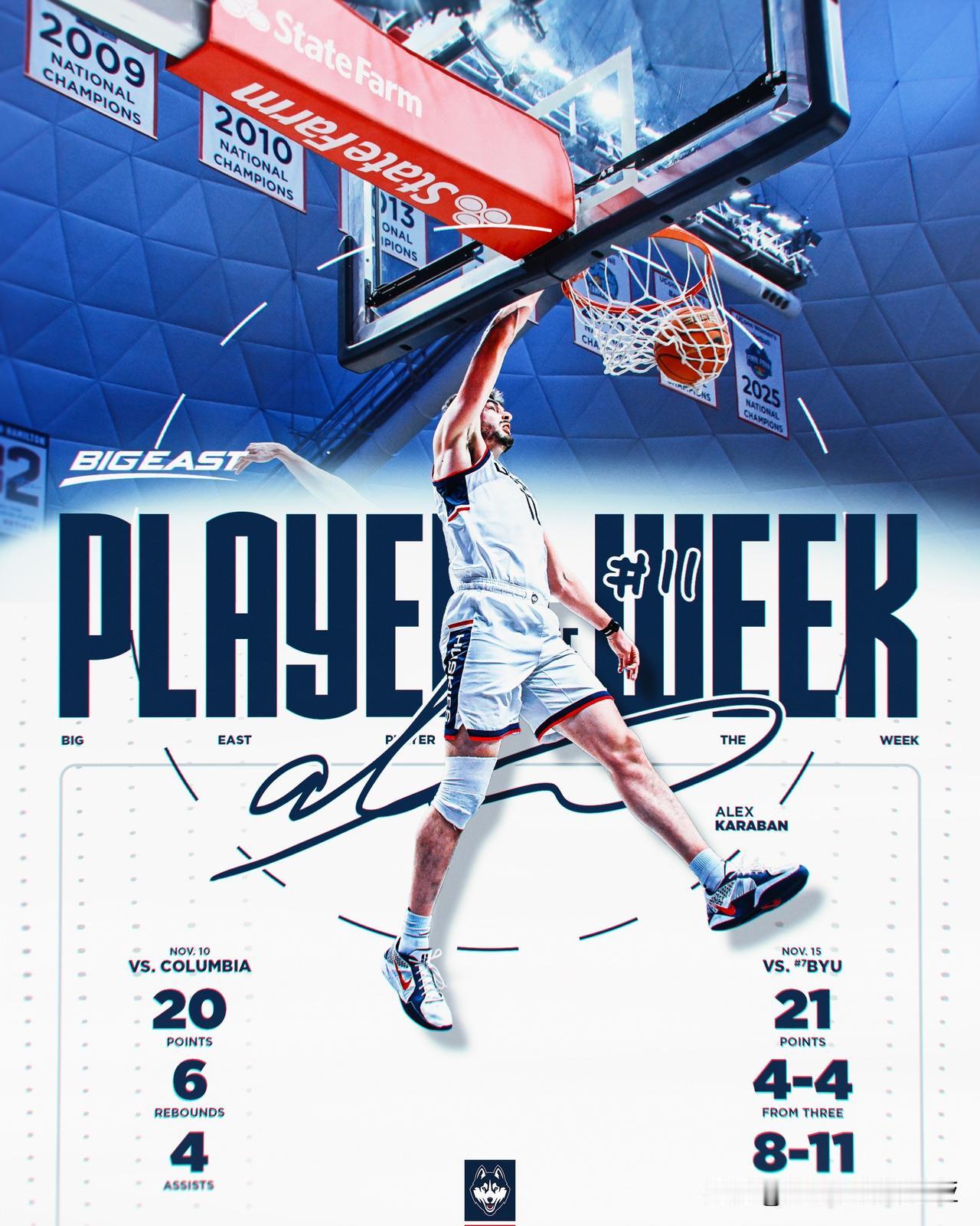 杜克Cameron Boozer与路易维尔Mikel Brown Jr共享ACC联盟上周最佳球员与最佳新人,佛罗里达Thomas Haugh与田纳西Nate Ament成为SEC最佳球员与最佳新人,休斯顿Kingston Flemings当选Big 12最佳球员,维拉诺瓦Acaden Lewis被评为Big East最佳新人,康涅狄格Alex Karaban是大东最佳球员。