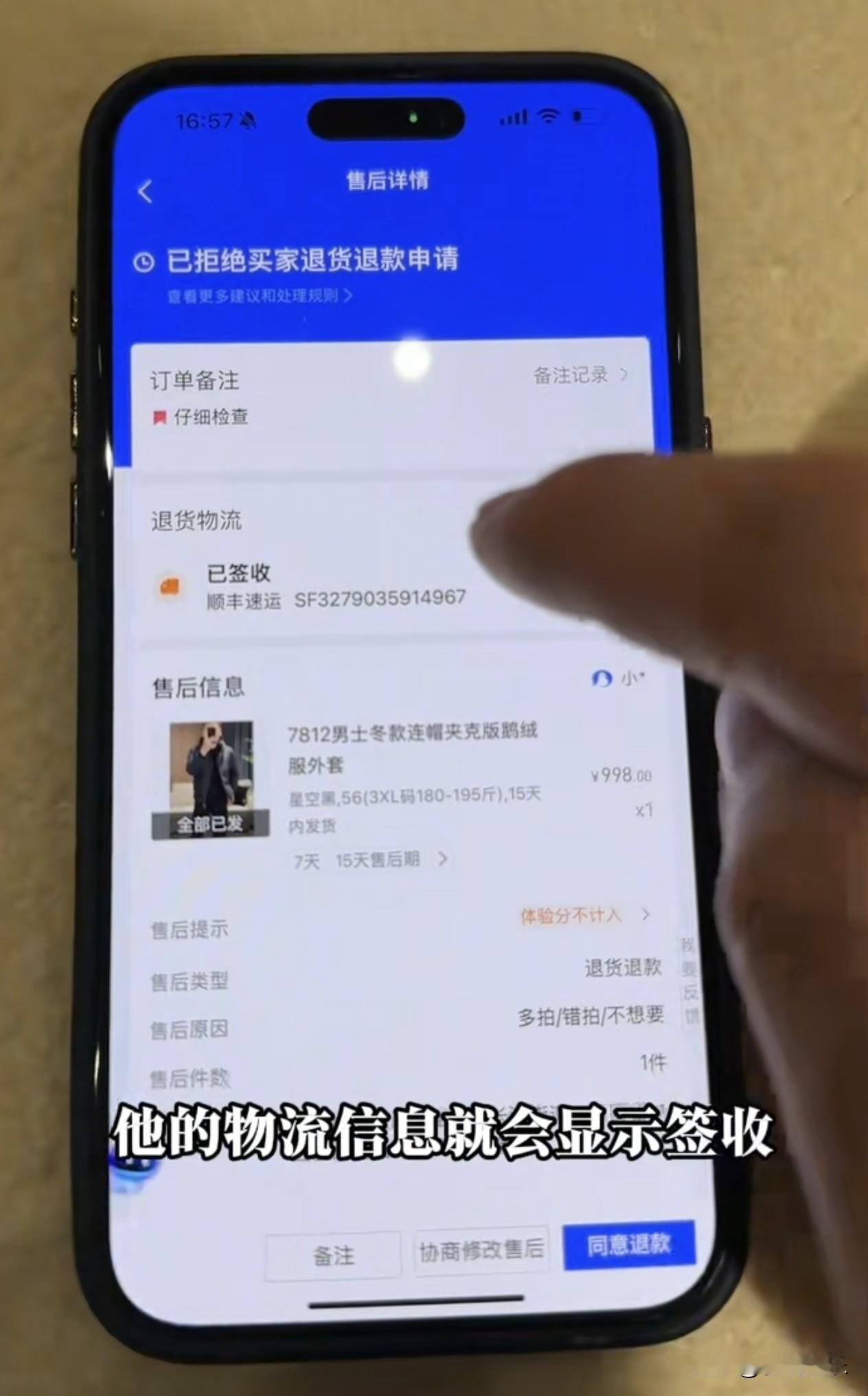 女大学生退货羽绒服变手机壳!快递员一个举动揭开“白嫖党”新套路 你有没有想过,你网购一件衣服,再退款退货,但把物品换成其他东西,这是不是就白嫖了? 近日,有位女大学生就相信了这种“零成本购物”。她网买近千元羽绒服后,用手机壳退货,想要蒙混过关骗取退款。她在填收件人信息时候,把收件名字和电话换成自己的,当快递小哥联系自己时候,她强烈要求对方帮签收,并将里面东西扔了。 一旦这么做了,但赔钱的就会商家或者快递小哥,这招不可为不阴啊!所幸快递员留了个心眼,拍了视频,商家也及时识破,才没让这场“狸猫换太子”的戏码得逞。 这种“空手套白狼”的套路屡见不鲜,最后受伤的是实际操作人或者商家,那些躲在背后指导的人不会露脸的。这提醒我们:灰色产业链专坑贪便宜的人——记住,天上不会掉馅饼,但很容易掉陷阱。(图片来自网络)