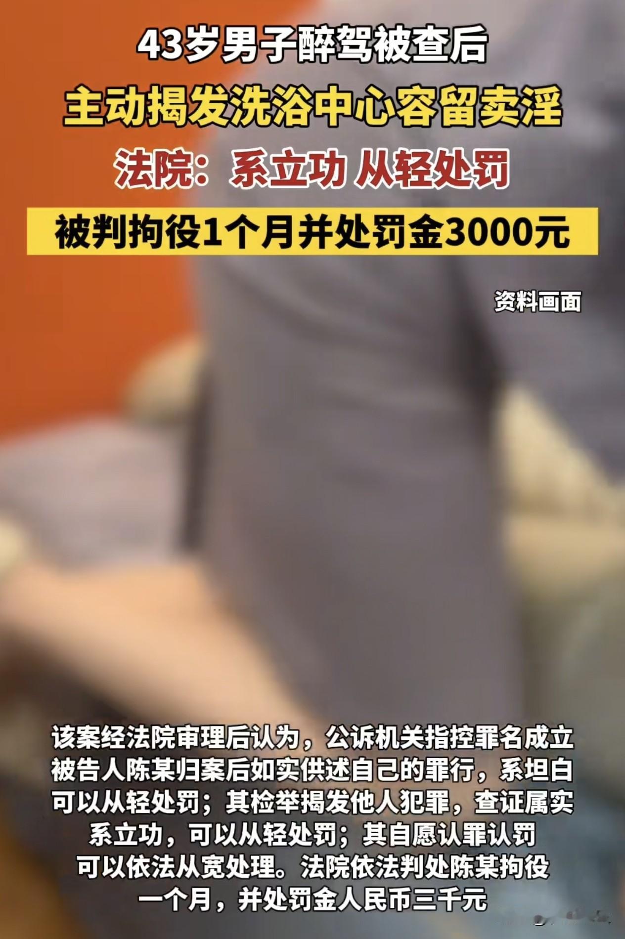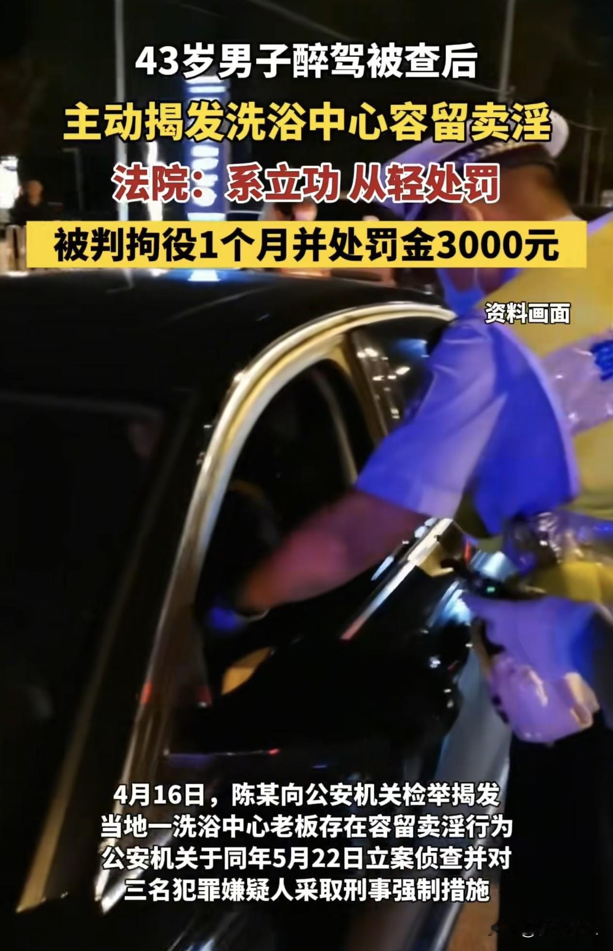 43岁男子醉驾被抓,“机智”举报洗浴店卖淫,获得减刑! 43岁的陈某刚从酒桌下来,开着车就被交警拦下了。一检测,血液酒精值192.8mg/100ml,远超醉驾标准!了解醉驾的朋友们肯定知道,这要是判下来,绝对是要踩缝纫机了。 但这位陈先生“临危不乱”,取保候审期间,他干了一件事令人意想不到的事情。他居然举报一家洗浴中心老板容留卖淫!警方一查,情况属实,立马立案抓了三个嫌疑人。 完了法官也是活久见,头一次遇到这种情况。最后法庭认为陈先生坦白醉驾事实+举报他人犯罪+自愿认罪认罚,三重“减刑buff”叠加!最后判了拘役一个月,罚金三千。这惩罚相比踩缝纫机,简直可以忽略不计的。 就是不知道洗浴店老板如果知道是被客人这样举报,内心不知道还能不能绷住? 不管怎么说,这种算是特例,朋友们还是要严格遵纪守法,不要触碰法律底线哦。(图片来自网络)