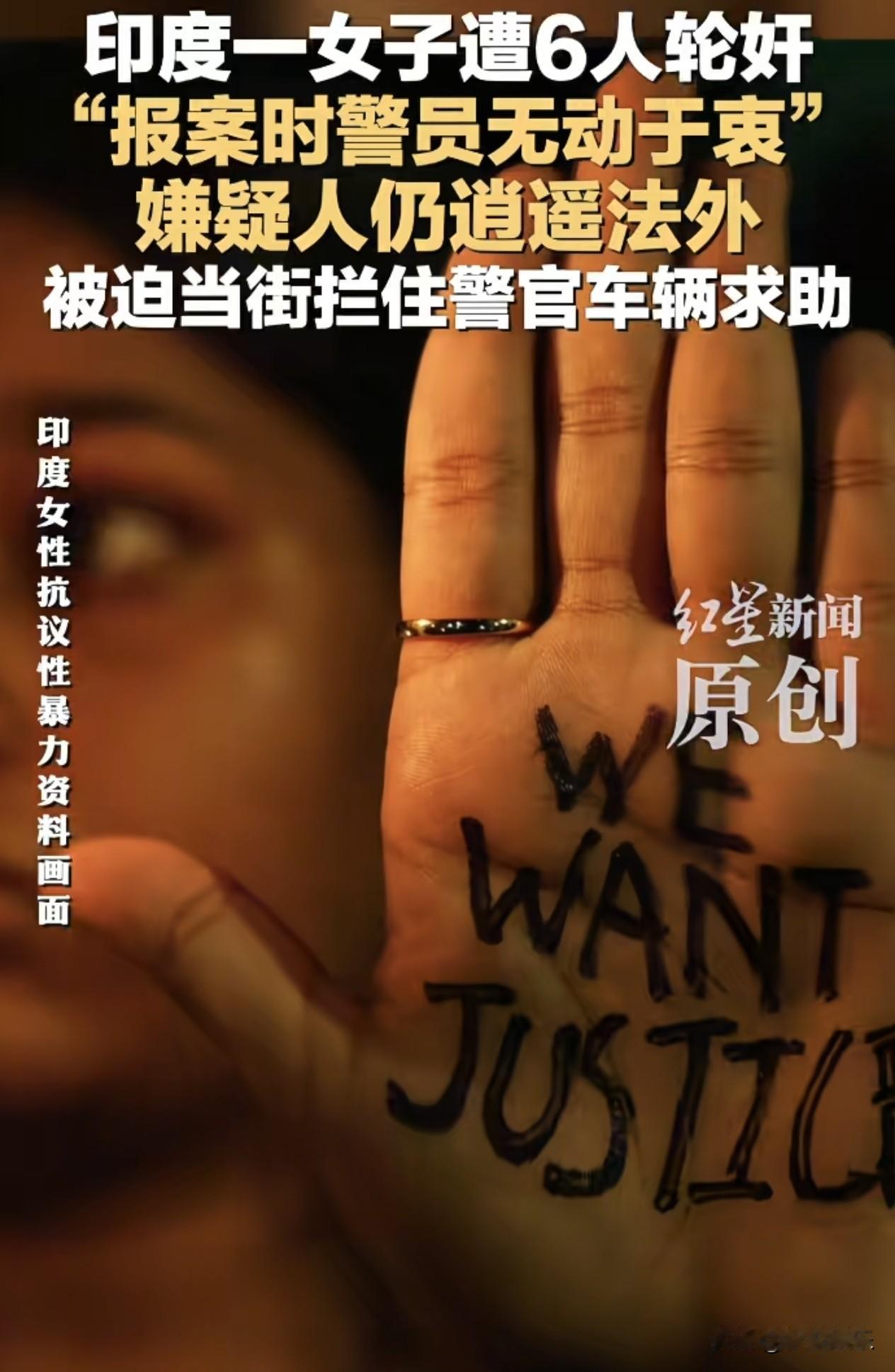 印度女子遭6人轮奸后拦警车反被阻!她的勇气撕破了谁的脸面? 生在安定国家的我,可能真的没办法理解,怎么会有如此荒唐的事情? 新闻看了吗?印度女子遭到6名男子侵犯,好不容易逃出来了,还拦下一辆警车,以为自己终于得救了。结果做梦都没想不到,警察居然跟其他路人一起拦住该女子,捂住她嘴不让说话。 好在这一幕被人用镜头完整拍下来,涉事的警察被免职,官方承诺追捕所有嫌疑人。 但这真的只是免职和抓人的问题吗? 前不久,该地区曾有轮奸受害者被涉案律师借“调解”之名再度侵犯,这一桩桩、一件件都在告诉世人:印度部分地区的司法系统,正从“保护者”异化为“二次伤害者”。 都说雪崩的时候没有一片雪花是无辜的,如果警察以及那些执法人员,在公民受到侵犯时,没有出手阻止,那跟侵犯人有什么区别? (图片来自:红星新闻)