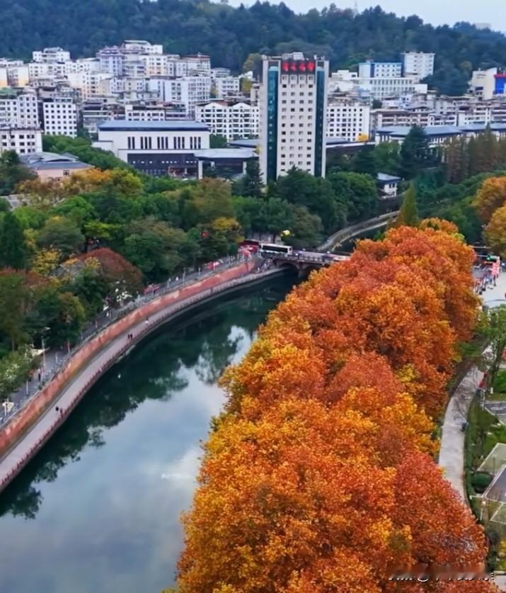 这风景是我们遵义的凤凰山广场,湘江河的两旁。两旁的梧桐叶黄了,是一道靓丽的风景线。 湘江边的梧桐叶黄了,我们遵义人的初冬便有了形状。老人们在树下打太极,落叶轻轻落在肩头;孩童追逐着飘飞的黄叶,笑声惊起枝头雀鸟。竹漂爱好者,在音乐与湖水的相伴下漂移着独特的舞姿。咖啡馆的落地窗前,人们捧着热饮看叶影摇曳,手机镜头里定格下这抹金黄。这些梧桐是城市最忠实的季节信使,年复一年用色彩提醒我们:生活不必远行,转身即是诗意。 湘江河的碧波轻吻着岸边,将凤凰山麓的梧桐黄叶揽入怀中。金黄的叶片随风飘落,在江面铺就一条流动的锦缎,阳光穿透叶隙,在水面投下斑驳的光影,仿佛碎金在跳跃。晨雾中,白鹭掠过水面,惊起涟漪,与飘落的黄叶共舞,构成一幅灵动的秋日画卷。暮色四合时,整条湘江被染成暖色调,连空气都浸着蜜糖般的甜香,这就是我们遵义独有的温柔。