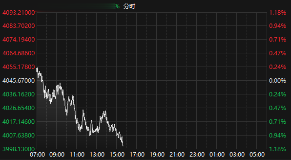 上证报中国证券网讯据Choice数据,11月18日,国际现货黄金震荡走低,截至15:39报3999.83美元/盎司,日内跌超1%。