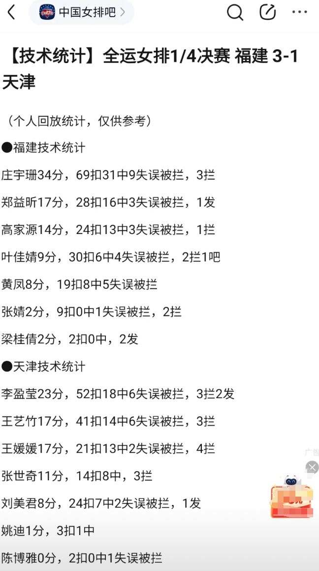 李盈莹赛后接受采访时说,这场失利也是给我上了一课!我觉得失败并不可怕,可怕的是大家没有从失败中总结出东西来。可能对每个人来说,这场比赛都意义非凡。 李盈莹谈到自己职业生涯一路坎坷,东京奥运会八强不入,又在比赛中受伤,一度失去打球的兴趣,甚至有了退役的想法。随着伤势好转和时间沉淀,觉得还是要坚持走下去,不忘来时路吧。她谈到这次比赛中自己的体能出现问题,她说她受伤后停赛九个月,直到全运会前一个月才开始系统训练,体能储存不够确实影响到自己的场上发挥。