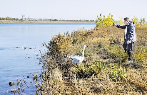 11月14日,高玉喜与康复放飞的小天鹅依依惜别。