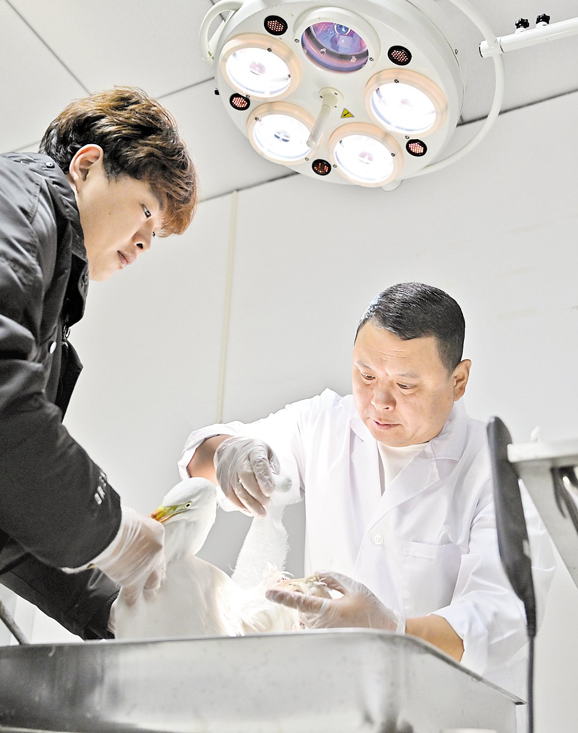11月14日,高玉喜(右)和志愿者为受伤的白鹭诊治。