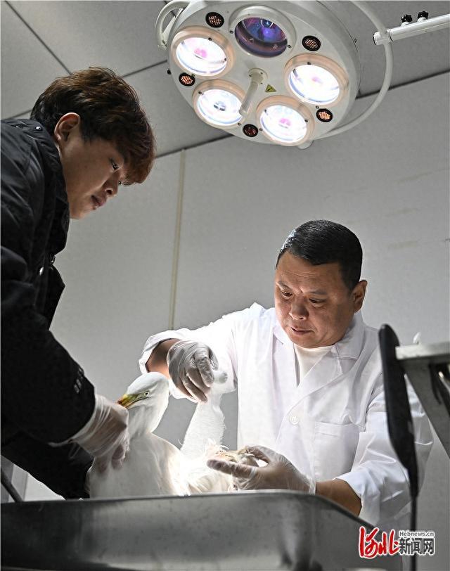 11月14日,高玉喜(右)和志愿者为受伤的白鹭诊治。