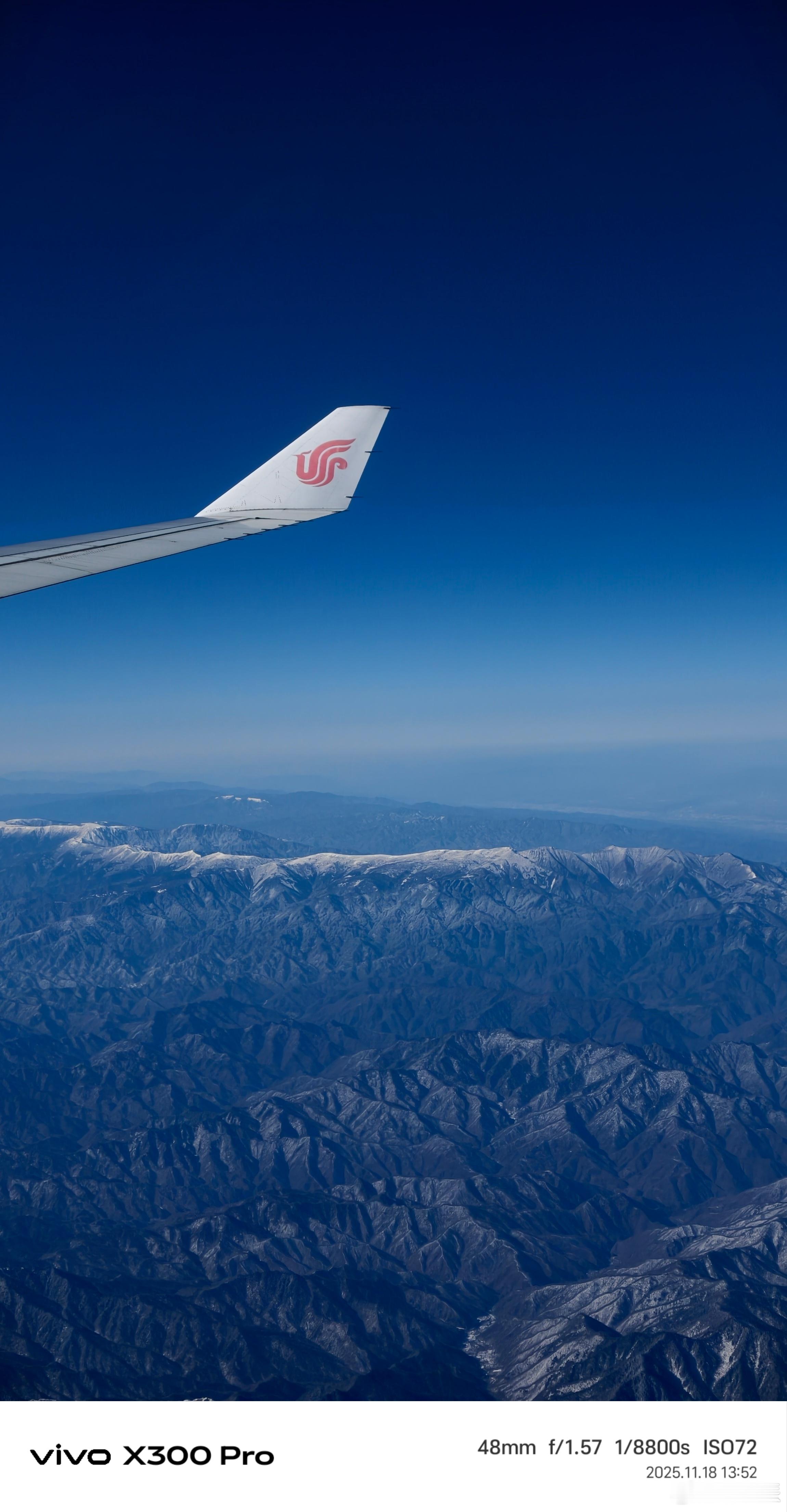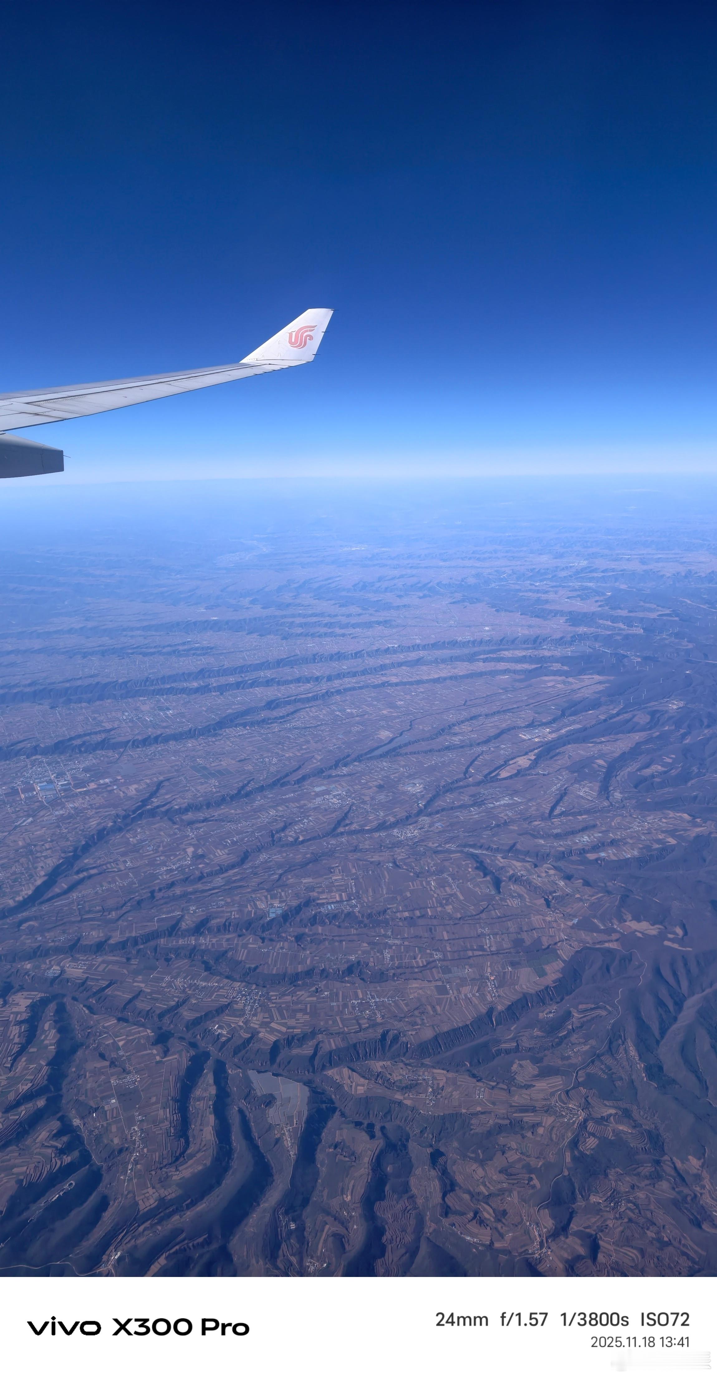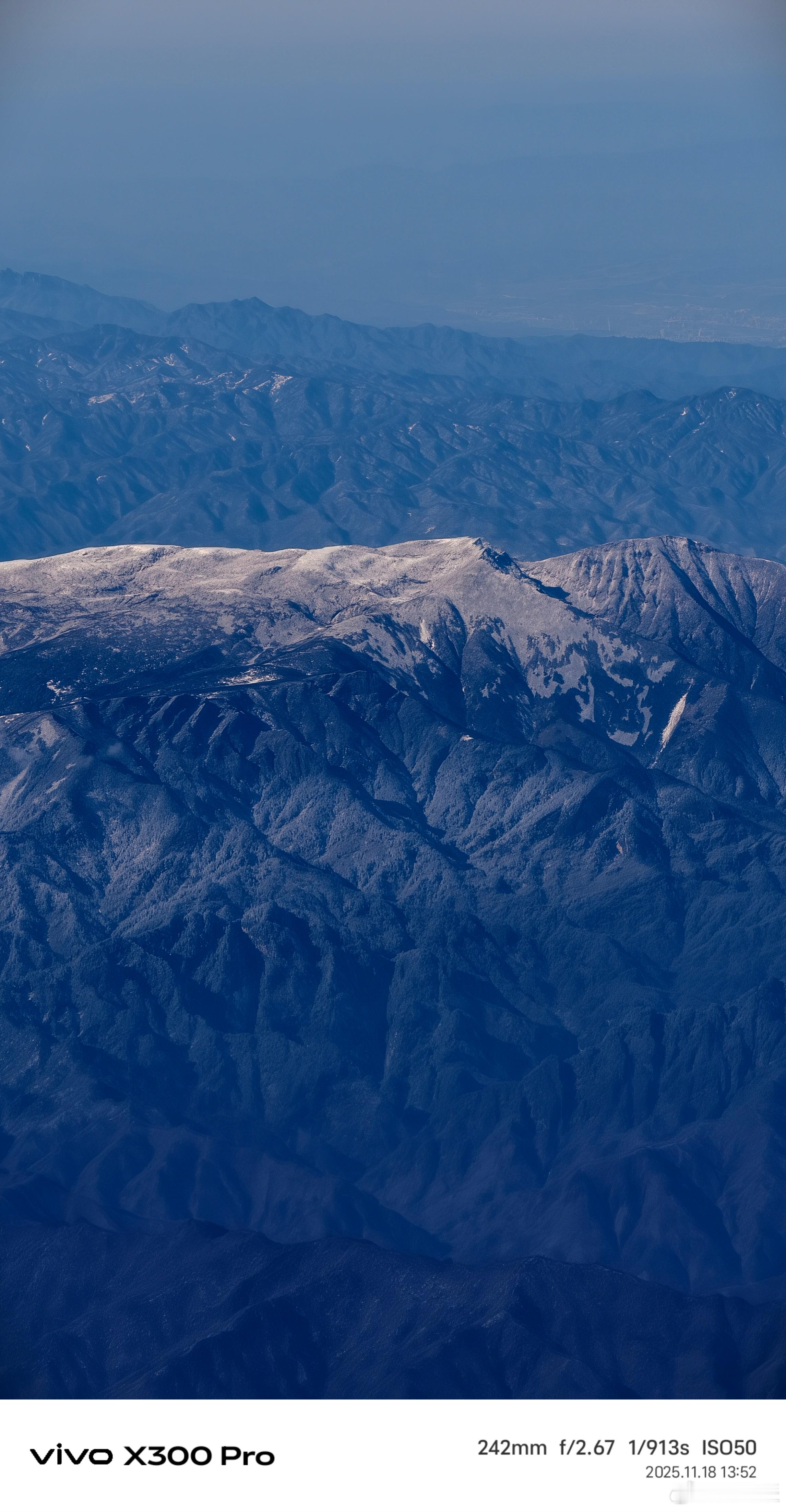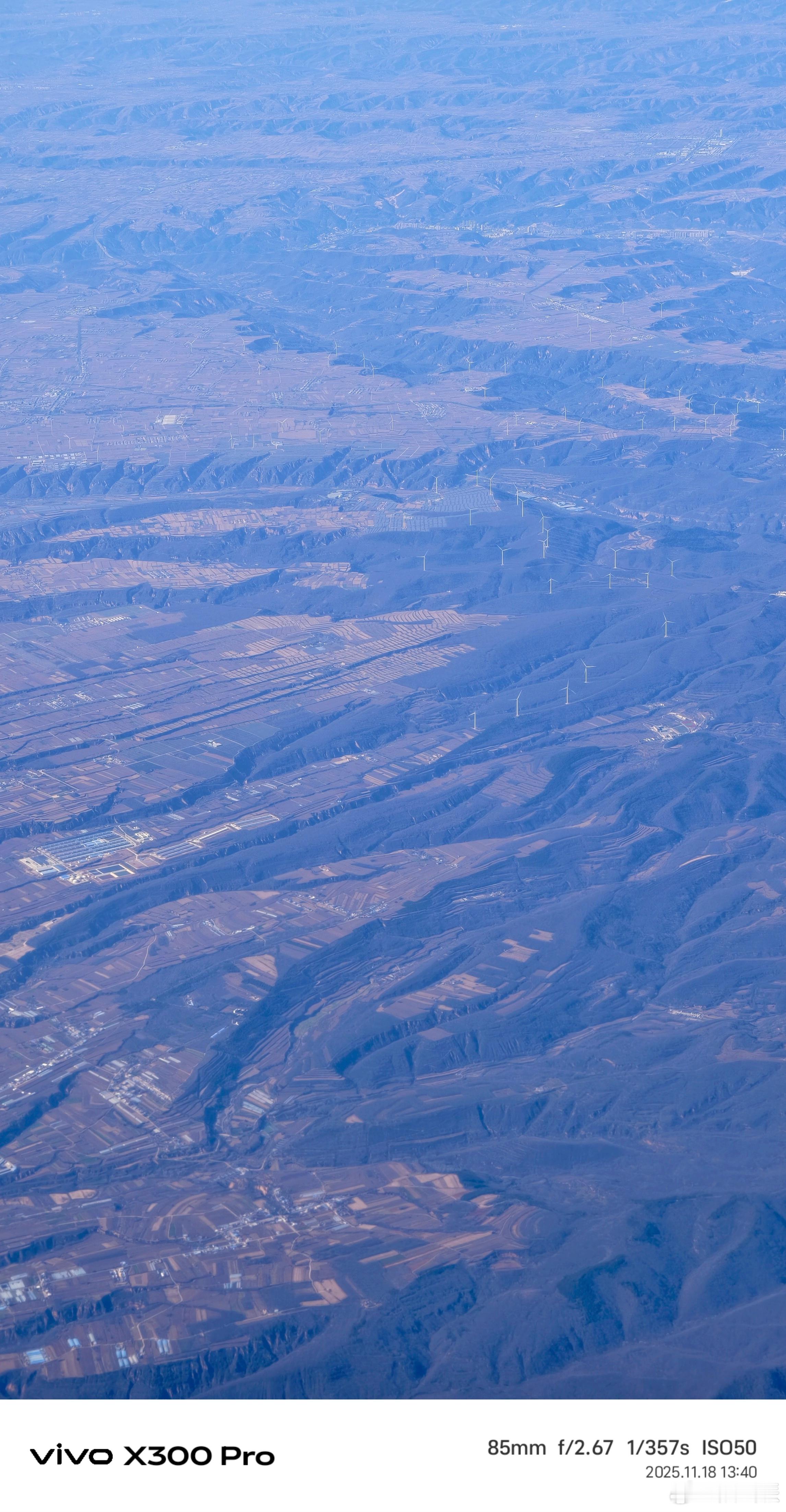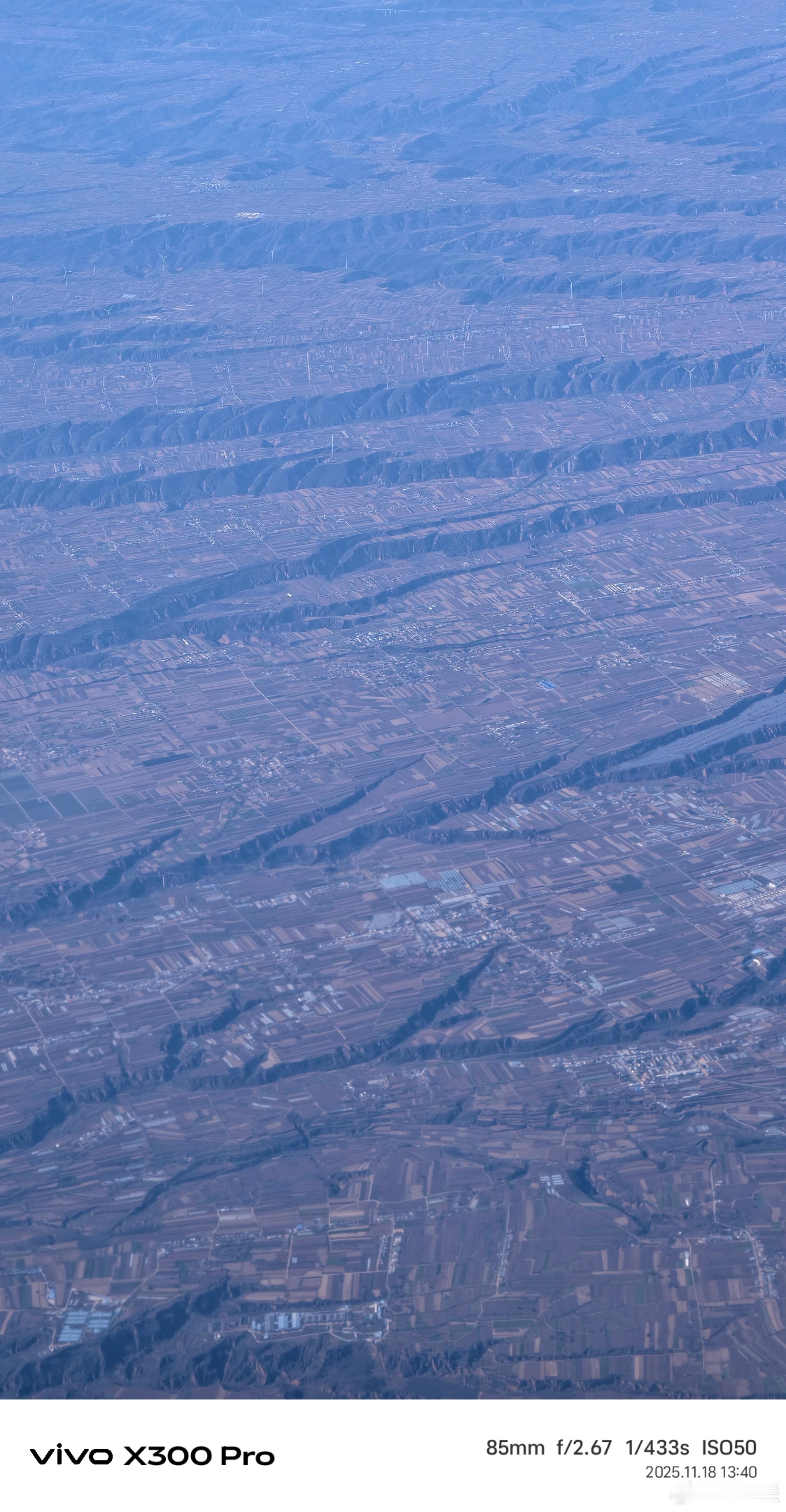 绵延的山脉,积雪的太白,还有千沟万壑之上的平原,虽然知道秦岭是我国南北气候的分界线,长江、黄河的分水岭,但第一次从飞机上以上帝视角观看时,还是有被震撼到。用vivo X300 Pro拍了几张大家感受下这大自然的鬼斧神工。一直以为平原只在高山之下,但这里的平原却在沟壑之上,而且像是被刀切过一样平,参考图5-9。