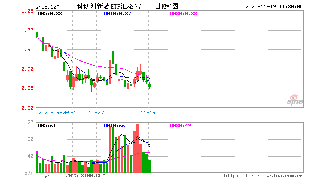 11月19日,截止午间收盘,科创创新药ETF汇添富(589120)跌1.73%,报0.851元,成交额2650.18万元。科创创新药ETF汇添富(589120)重仓股方面,百济神州截止午盘跌2.03%,百利天恒跌1.89%,博瑞医药跌3.02%,君实生物跌1.26%,艾力斯跌1.48%,泽璟制药跌0.20%,荣昌生物跌2.86%,益方生物涨0.11%,特宝生物涨0.69%,迈威生物跌2.04%。