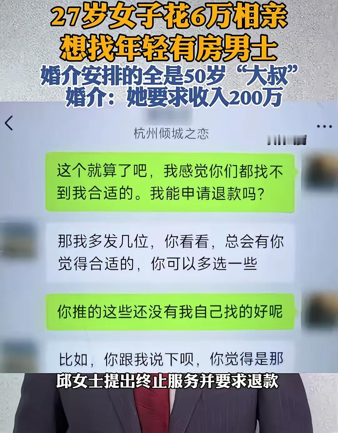 在这个看似繁华的城市背后,隐藏着一个令人唏嘘的现实:我们在追求理想伴侣的路上,似乎越走越迷失。杭州,27岁的小林(化名)花了整整6万元,只为找到那个“理想中的他”——年轻、有房、经济条件优越的伴侣。她满怀期待,认为自己用心投入,终究会迎来属于自己的幸福。 然而,等待她的,却是一场“荒谬”的闹剧。婚介公司安排的“理想对象”全是50岁左右的“大叔”?这个结果让她震惊、愤怒,也让人不禁深思:在这个“看脸”和“金钱”决定一切的时代,年轻、颜值、财富,哪个才是真正的“硬通货”? 她质问:难道我花了这么多钱,就只换来一场“虚假广告”?她觉得自己被欺骗了,要求退款。而婚介公司则冷静回应:“她要求年收入200万,年轻男人有几个能达到这个收入?”一句话,道出了这个行业背后潜藏的“潜规则”。 其实,这不仅仅是一次简单的退款事件,更是一面镜子,映照出当代年轻人在爱情与现实之间的迷茫与挣扎。我们都渴望一份真挚的感情,却被市场的“标签”绑架,被“条件”绑得喘不过气来。有人说,爱情不应该是“条件交换”,但在现实中,多少人为了“门当户对”而苦苦挣扎?又有多少人为了“面子”和“面子”背后的“利益”而妥协? 更令人深思的是,婚介行业的“套路”似乎早已成为潜规则。广告上那些“高富帅”的光鲜亮丽,背后隐藏的,却是“条件匹配”的虚假承诺。年轻男人的“高收入”究竟有多少能实现?而那些“高收入”的“理想伴侣”,又有多少是真心的?这场“爱情的游戏”,到底是谁在操控?又是谁在被操控? 小林的故事,让我们不得不反思:在这个“物欲横流”的社会,爱情变得越来越像一场“交易”。我们追求的,究竟是“幸福”还是“面子”?又有多少人在“条件”之外,真正找到那份纯粹的感情?还是说,大家都在用“条件”筑起一道看不见的围墙,阻隔了最本真的心灵相遇? 或许,我们都应该停下来,问问自己:在这个充满诱惑和陷阱的市场中,什么才是真正值得我们去追求的?是那份“看得见”的财富,还是那份“看不见”的真心?当“年收入200万”成为衡量幸福的唯一标准时,我们是否也迷失了最初的自己? 这个故事,或许只是冰山一角,但它折射出的是整个社会的“价值观”变迁。我们需要的,或许不是“条件匹配”的爱情,而是那份勇敢去爱、敢于付出、真心相待的勇气。只有这样,我们才能在这场“爱情游戏”中,找到属于自己的那份纯粹与幸福。 你怎么看?在这个“条件至上的时代,爱情还能纯粹吗?”欢迎留言,和我一起讨论这个令人深思的话题。