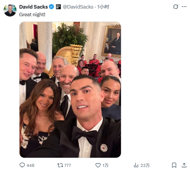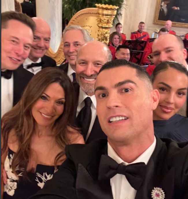 该图为C罗拿着手机自拍的视角,图中包括乔治娜、马斯克、因凡蒂诺等人。之后马斯克还在该推特下评论。