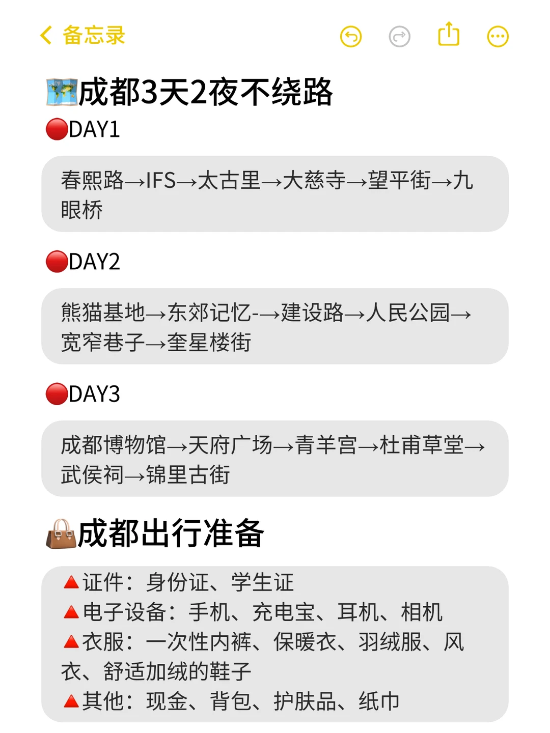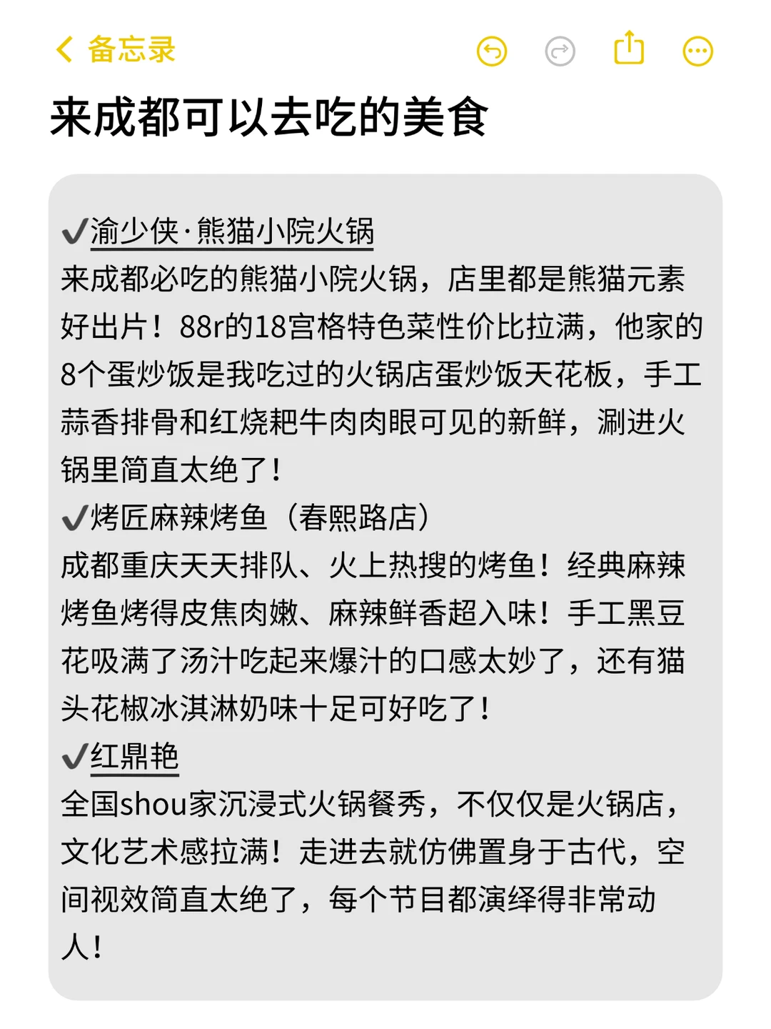 📍成都已回,心潮难平,这趟旅程真的太难忘!😅忍不住把一路的亲身体验和踩过的坑分享给大家💢 计划来的朋友们一定收好这份真心建议👭🏻 · 💡 亲测实用经验 ✅ 早晚温差大,需备长袖衬衫、外套、长裤,建议带厚毛衣或冲锋衣 ✅需要备好面霜、唇膏,特别容易干裂 ✅高铁动车站的出租🚖尽量不打,建议选择大平tai的网月车,安全有保障! · 🚗行程不绕路 D1: 春熙路→IFS→太古里→大慈寺→望平街→九眼桥 D2: 熊猫基地→东郊记忆-→建设路→人民公园→宽窄巷子→奎星楼街 D3: 成都博物馆→天府广场→青羊宫→杜甫草堂→武侯祠→锦里古街 · 👑关于我们吃什么 📍渝少侠·熊猫小院火锅:成都必打卡的熊猫小院火锅,熊猫元素满满太可爱啦! 📍红鼎艳:全国第1️⃣家沉浸式火锅餐秀,古典和现代结合,完美融合了火锅和川剧~ 📍烤匠麻辣烤鱼(春熙路店):川渝天天排队的烤鱼,恰到好处的经典麻辣烤鱼泡在汤汁里吃起来巨巨巨香! . 💐喜欢香香的姐妹可以试试. 更多旅游攻略看这里成都成都旅游成都旅游攻略成都美食成都火锅成都火锅餐秀成都吃喝玩乐成都打卡金色印象成都住宿