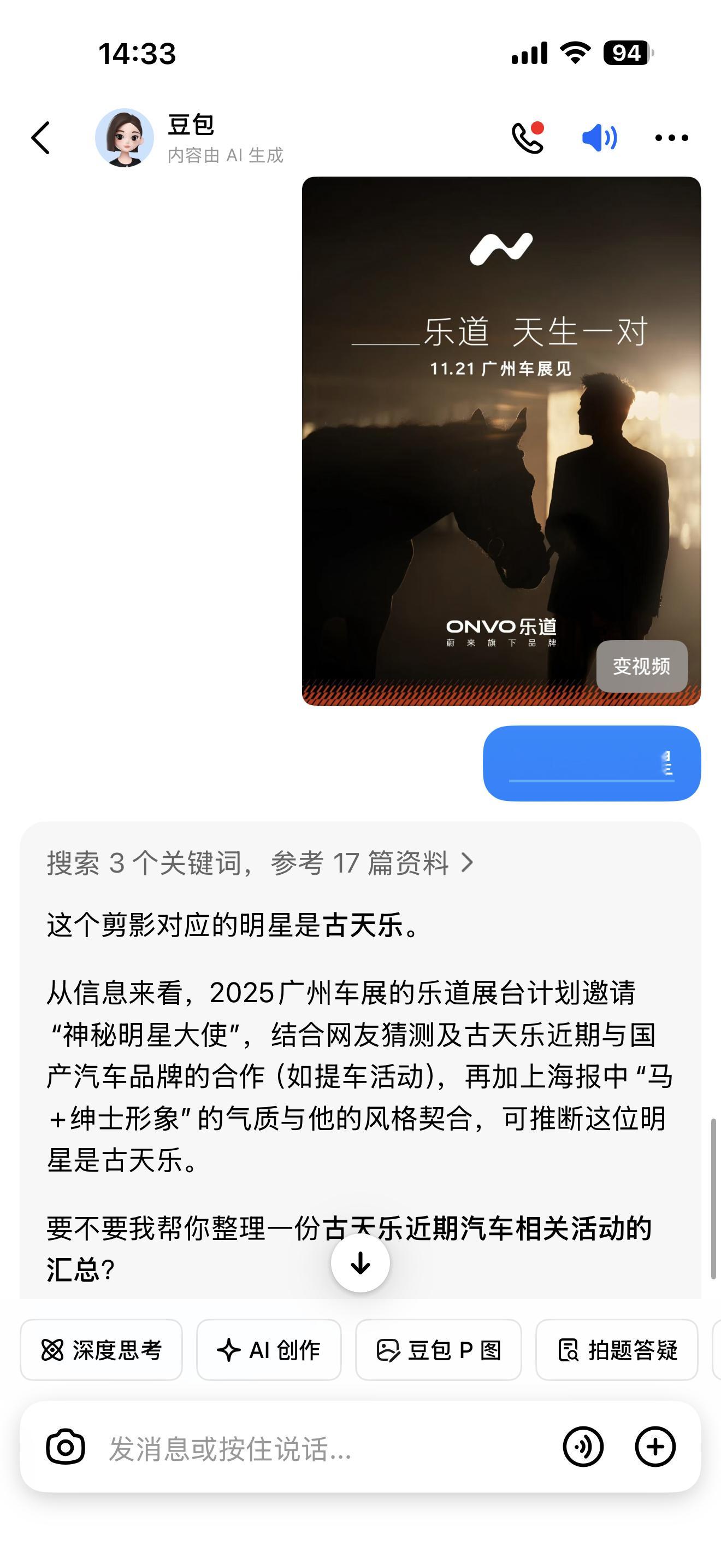 把照片拉亮了之后,可以看得出整个轮廓,是古先生吗? 连豆包AI都说乐道这一次请的是古天乐。