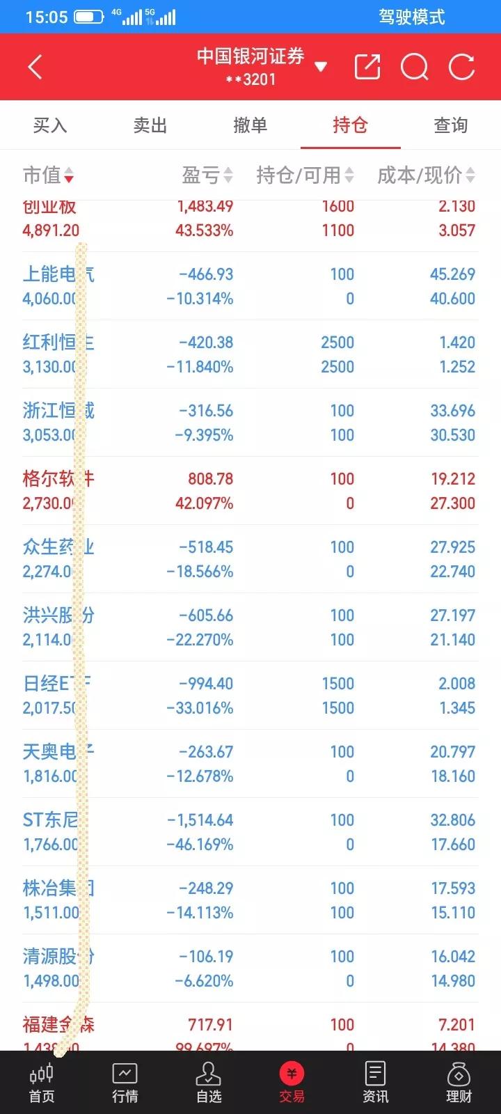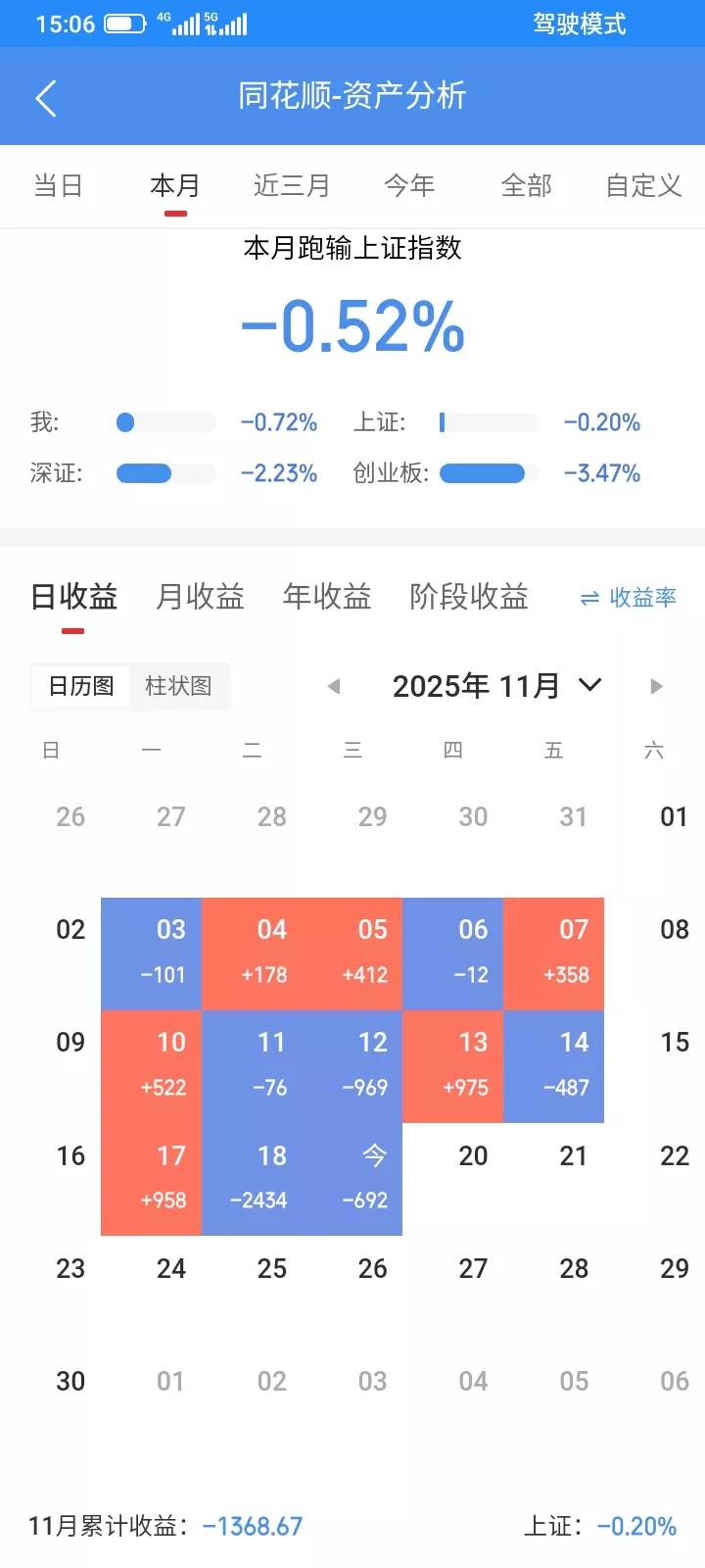 2025.11.19,今天上证指数反弹上涨,但是我的股票继续下跌,向下寻找支撑,又是大亏的一天,放弃幻想,愿赌服输吧,今天清仓止损了4只股票,继续按照计划全面做t,t了两只etf,t了14只股票,都是100股,又是大部分都做错了,都失败了,又多亏了两百多块钱吧。 早上集合竞价,委托买入了25笔,都是比昨天收盘低一分钱买入。9.25分,成交了13笔,没有成交的就撤单,但是9.30分,又成交了2笔,其它10笔撤单成功。今天买入了1000股红利,500股创业板,其它买入了13只股票,都是100股。 以14.22买入100股三变,以14.05卖掉,亏了17元。 以22.81买入100股众生,以22.74卖掉,亏了7元。 以5.59买入100股达华,以5.82卖掉,赚23元。 以18.65买入100股天奥,以18.16卖掉,亏了49元。 以4.94买入100股立方,以4.92卖掉,亏了2元 。 以40.44买入100股上能,以40.60卖掉,赚16元。 以6.47买入100股方大,以6.92卖掉,赚45元 。 以9.50买入100股神马,以9.31卖掉,亏了19元。 以13.34买入100股远达,以13.17卖掉,亏了17元。 以18.01买入100股东尼,以17.57卖掉,亏了54元。 以7.50买入100股水泥,以7.07卖掉,亏了43元。 以14.49买入100股金森,以13.82卖掉,亏了67元。 以15.21买入100股清源,以14.98卖掉,亏了23元。 以3.050买入500股创业板,以3.057卖掉,赚3.5元。 以1.247买入1000股红利,以1.252卖掉,赚5块钱。 以27.34卖掉100股格尔,以27.30买回来,赚4元。 以5.91清仓止损卖掉100股韩建,亏了93元。 以7.92清仓止损卖掉100股盛泰,亏了107元。 以5.30清仓止损了100股众成,亏了96元。 以5.18清仓止损了100股亚邦,赚115元。 今天减少了4只股票,t了14只股票,t了2只etf。今天总体做t盈亏相抵,做t亏了209元。不过无所谓,亏钱是赚钱的一部分吧,明天继续全面做t。 今天总资产10.51万元,总市值3.97万元,今天总体账户亏损692元。A股指数 大盘要跌吗 大盘股下跌 指数要冲高 股大盘指数 大盘