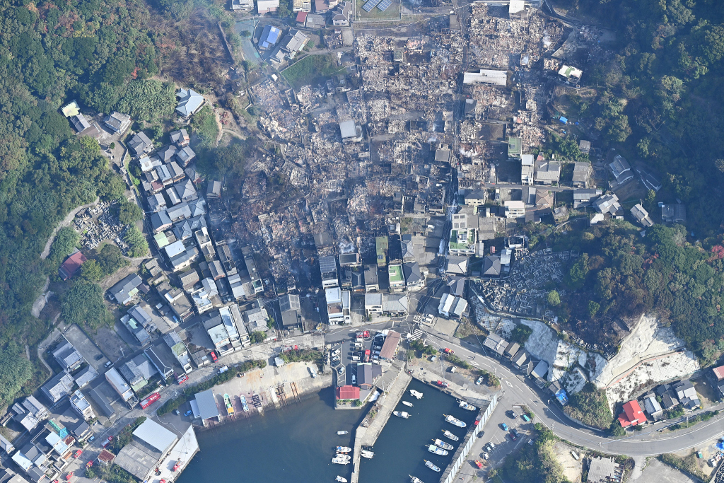 当地时间2025年11月19日,日本大分县大分市,大分县政府公布的航拍图显示,佐贺关渔港附近居民区发生火灾。视觉中国图