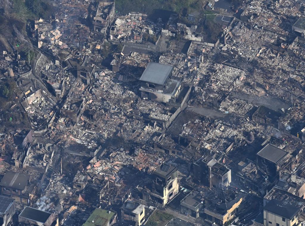 当地时间2025年11月19日,日本大分县大分市,航拍画面显示火灾现场。火灾于18日晚间发生,并蔓延至170多栋建筑。视觉中国图