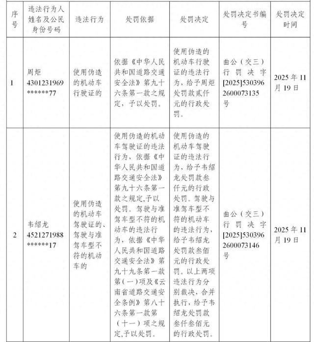 以下2名道路交通安全违法行为人未在法定期限内接受处理,公安机关交通管理部门已按法定程序作出行政处罚决定。因违法行为人提供的联系方式和地址无法送达,现予公告送达,扣留车辆的,违法行为人需到曲靖市公安局交通管理支队高速公路三大队办理车辆相关手续,同时违法行为人应到银行或使用“交管12123”手机APP输入处罚决定书编号按期缴纳罚款,逾期不缴纳罚款,每日按规定罚款额的3%加处罚款,加处罚款的数额不超过罚款本数。
