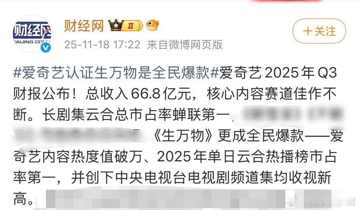 爱奇艺2025Q3财报公布特别提到杨幂《生万物》内容热度值破万,成全民爆款,2025年单日云合热播榜市占率第一,并创下中央电视台电视剧频道集均收视新高,影响力辐射文旅消费领域,连登爱奇艺二三季度财报,给平台带来了巨大营收,🥝认证过n次的台网口碑三连爆的《生万物》🐮