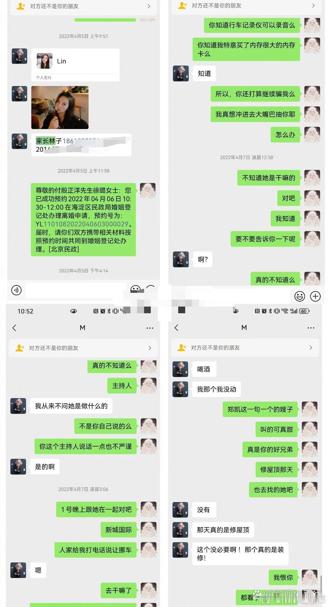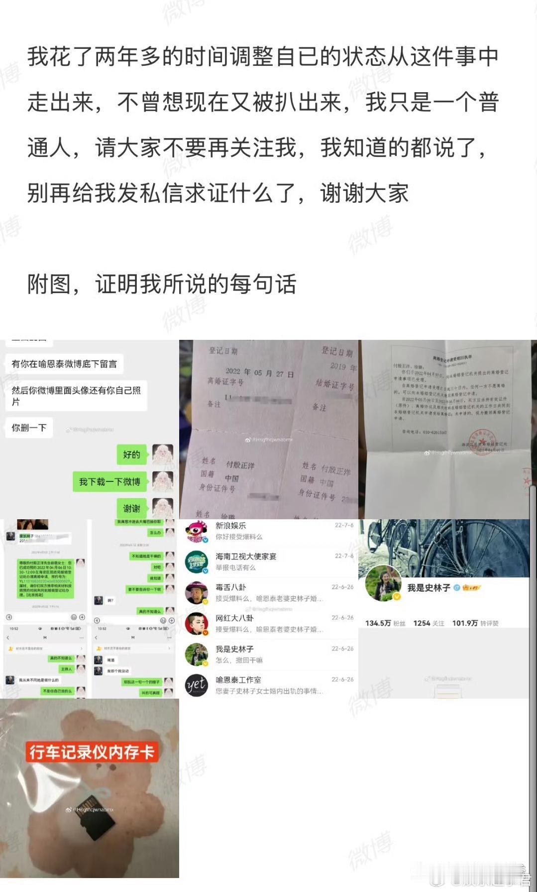 19日,有网友自称是史林子出轨对象前妻,称史林子与前夫殷正洋先生婚内出轨是事实。她晒出聊天记录及离婚证等证据,表示2022年4月初发现前夫与史林子双双婚内出轨,4月7日离婚,之后她几次试图曝光二人行为,但都没有得到任何回应。