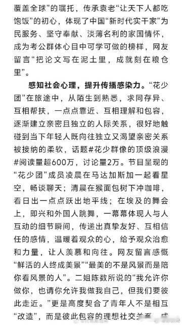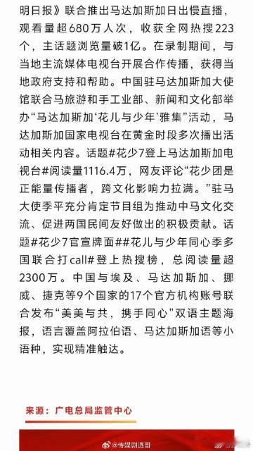 广电都发文夸花少7了,这节目肯定错不了!第一期就跑到马达加斯加割水稻,嘉宾们那认真劳作的样子太可爱了。节目在呈现群像魅力的同时,也让我们看到了海外中国人的拼搏精神。这么好看的节目,续集必须安排上,我还想继续感受这份温暖与感动!