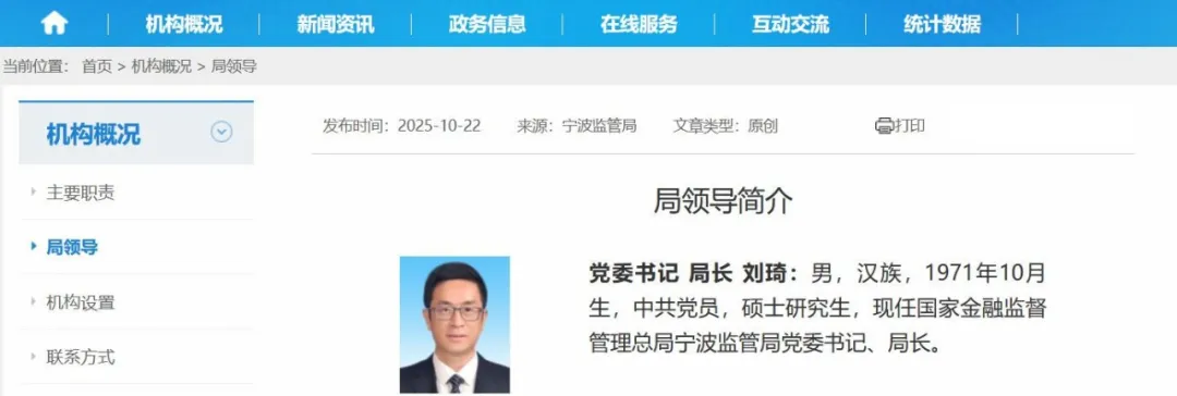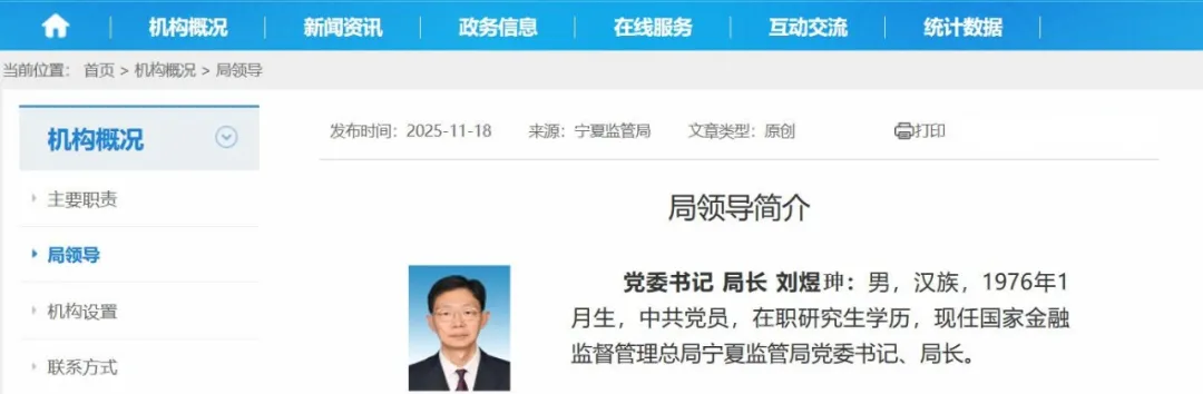 2025年11月18日,宁夏金融监管局“局领导”一栏显示,刘煜珅已经担任宁夏金融监管局党委书记、局长。