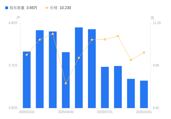 日期A股户数(户)流通A股户均持股数(股)户均持股市值(万元)2025-10-313661213144.5713.452025-09-303671813106.6213.082025-08-293747712759.6513.752025-07-313742712776.6413.622025-06-303964112063.0512.852025-05-313974712030.8712.102025-04-303829212488.0111.512025-03-313950612104.2613.132025-02-283958312080.9812.872025-01-313832812476.5612.67