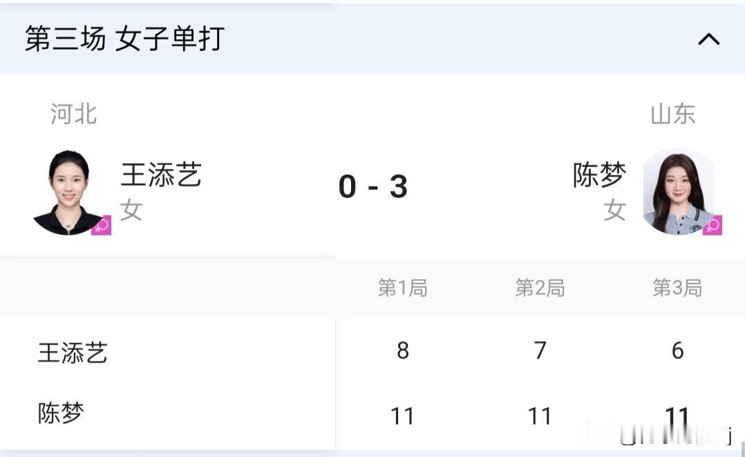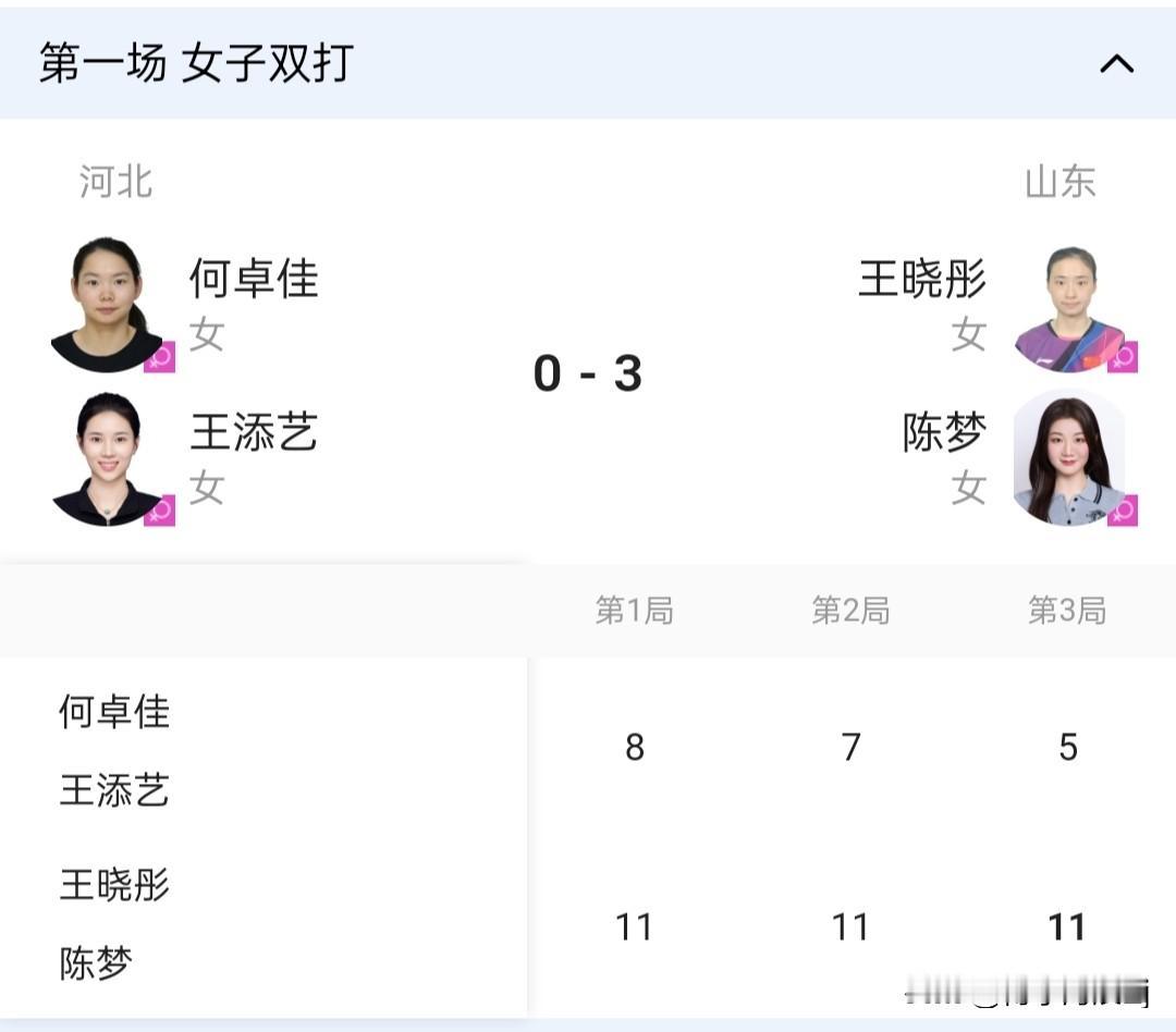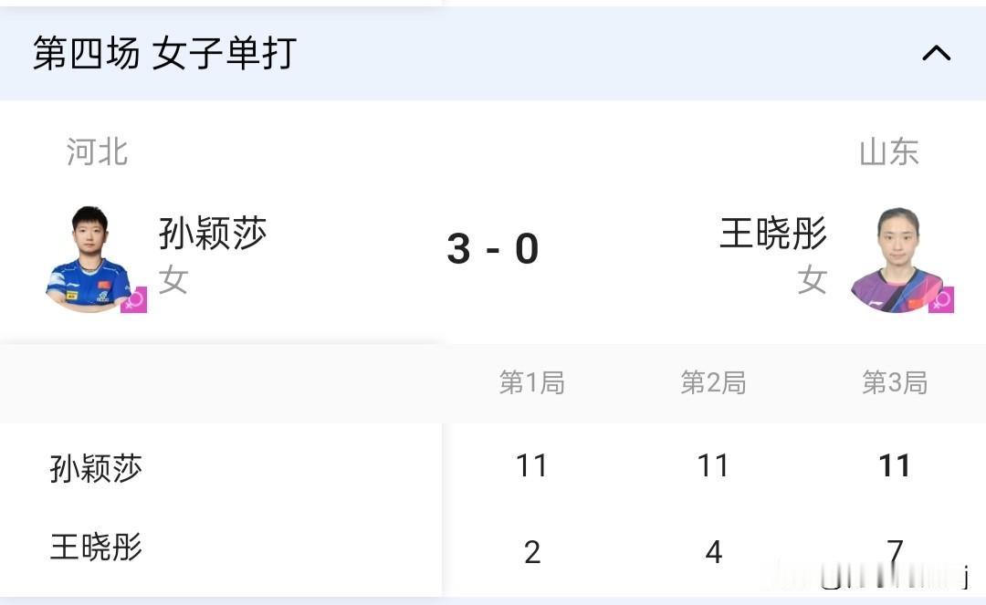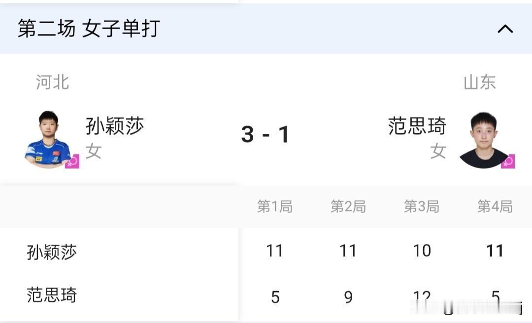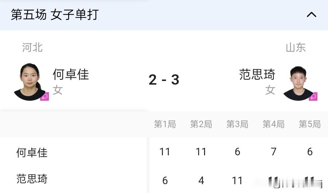 恭喜山东队3-2战胜河北队获得乒乓球女子团体金牌 比赛打进决胜局,范思琦逆境翻盘,在先丢两局0-2落后,连扳三局,以3-2获胜赢得最宝贵的一分,帮助山东队以大比分3-2获胜,获得本届全运会乒乓球女子团体冠军。 五场比赛分别是: 第一场女子团体比赛: 山东王晓彤/陈梦3-0战胜河北何卓佳/王添艺帮助山东队先获得一分 三局比分分别是: 11-8、11-7、11-5 第二场是女子单打: 孙颖莎3-1战胜范思琦,帮助河北队获得一分,大比分1-1 四局比分分别是: 11-5、11-9、10-12、11-5 第三场女子单打: 王添艺0-3不敌陈梦,陈梦再添一分,山东队大比分2-1河北队 三局比分分别是: 8-11、7-11、6-11 第四场女子单打: 孙颖莎3-0王晓彤,再助河北队拿下一分,大比分2-2平,把比赛打入决胜局 三局比分分别是: 11-2、11-4、11-7 第五场女子单打: 何卓佳2-3不敌范思琦,因此,范思琦帮助山东队拿到一分,以3-2获得第十五届全运会女子乒乓球团体比赛冠军 五局比分分别是: 11-6、11-4、6-11、7-11、6-11 范思琦 全运会山东金牌 全运会