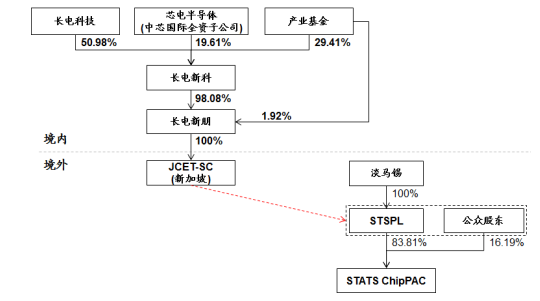 长电科技为本次收购之目的在苏州工业园区成立一家特殊目的公司长电新科,产业基金和芯电半导体根据《共同投资协议》的约定对其进行增资;长电新科为本次收购之目的在苏州工业园区设立长电新朋,产业基金根据《共同投资协议》的约定对其进行增资;长电新朋为本次收购之目的在新加坡设立JCET-SC(Singapore)Pte.Ltd.作为融资平台进行并购贷款融资,并作为本次收购的实施主体,即要约人。收购完成后JCET-SC(Singapore)Pte.Ltd.持有星科金朋最多100%的股权,而长电科技间接控股星科金朋。交易结构图如下: