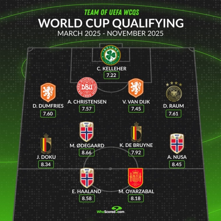 whoscored评本届世欧预最佳阵:2025年3月-11月