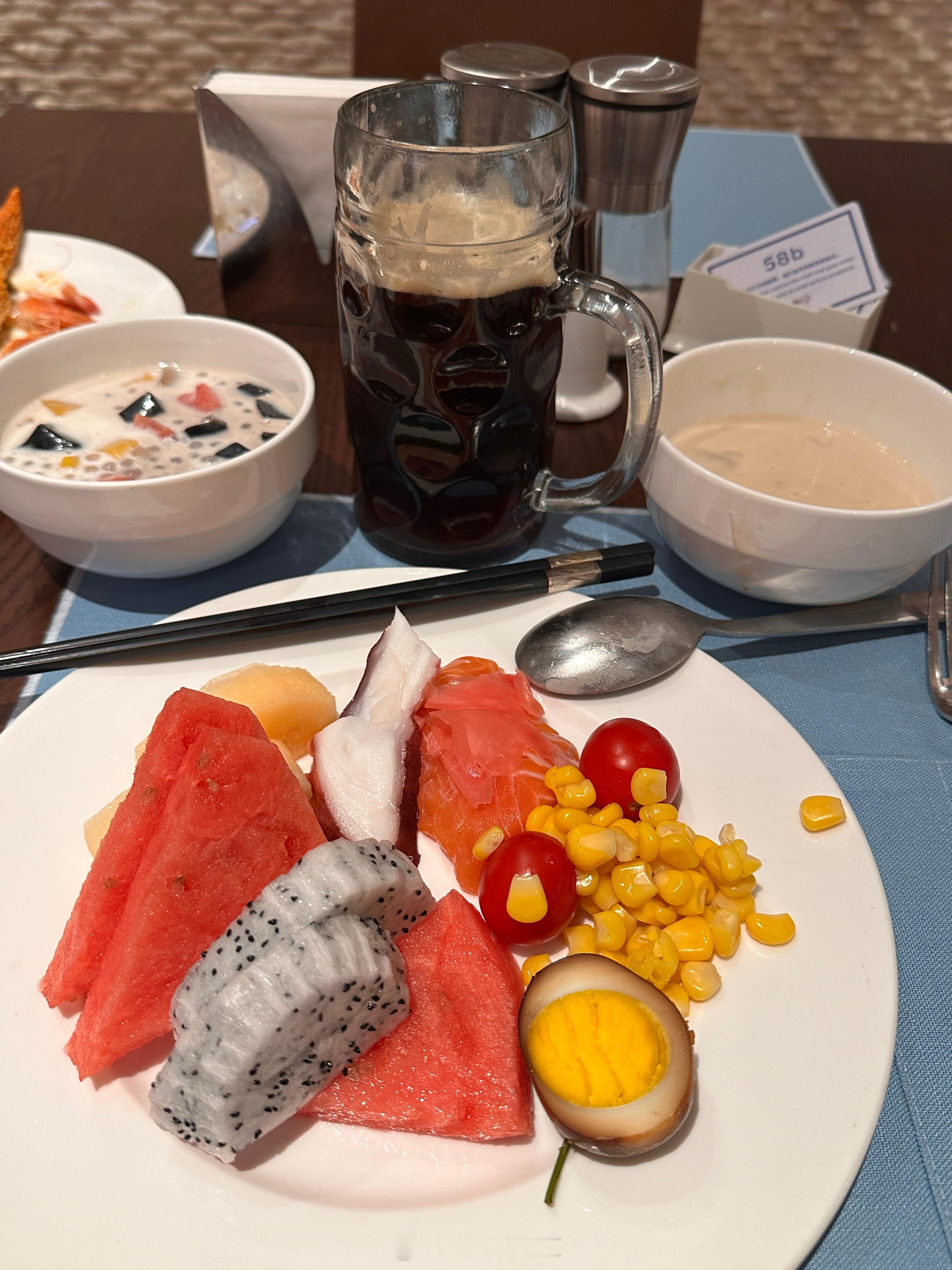 今日入住广州天河希尔顿酒店中午飞机上吃了一个面包,晚餐大快朵颐一翻,最后是“喝饱